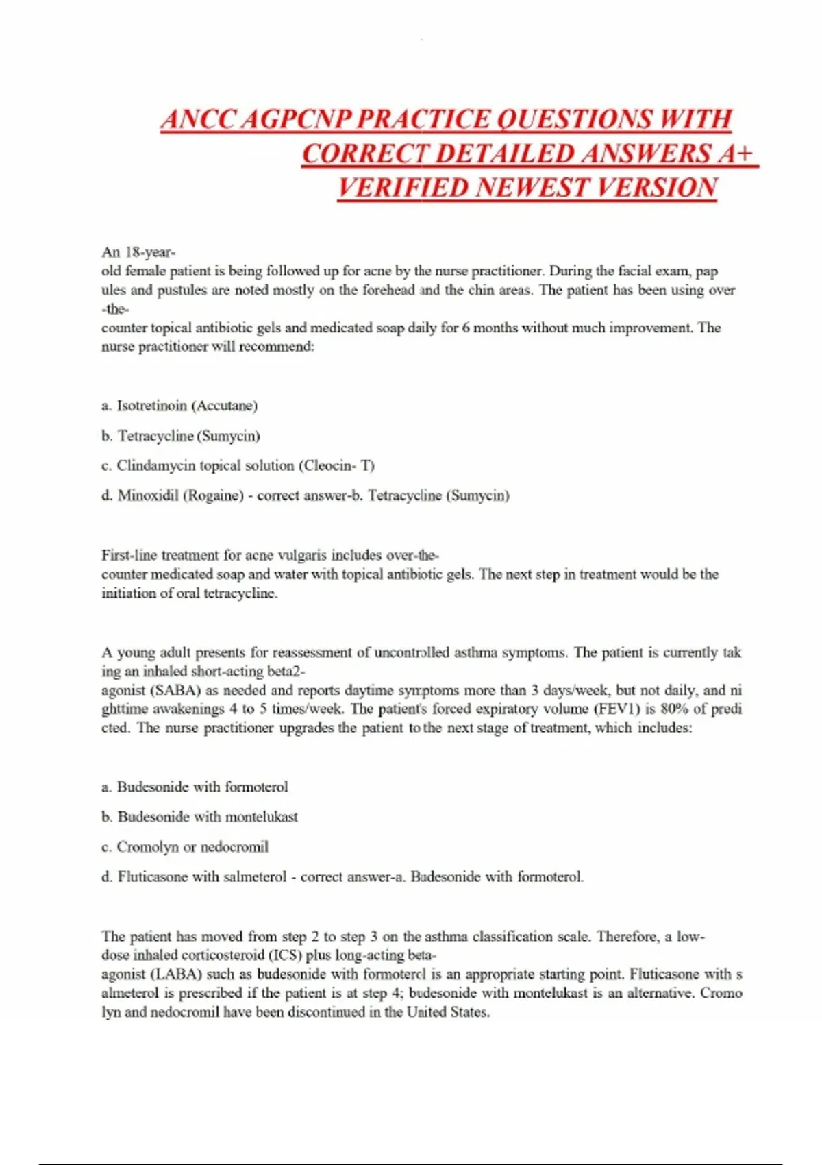 ANCC AGPCNP PRACTICE QUESTIONS WITH CORRECT DETAILED ANSWERS A+ VERIFIED NEWEST VERSION An 18-year- old female patient is being followed up for acne by the nurse practitioner. During the facial exam, pap ules and pustules are noted mostly on the forehead and the chin areas. The patient has been using over -the- counter topical antibiotic gels and medicated soap daily for 6 months without much improvement. The nurse practitioner will recommend: a. Isotretinoin (Accutane) b. Tetracycline (Sumycin) c. Clindamycin topical solution (Cleocin- T) d. Minoxidil (Rogaine) - correct answer-b. Tetracycline (Sumycin) First-line treatment for acne vulgaris includes over-the- counter medicated soap and water with topical antibiotic gels. The next step in treatment would be the initiation of oral tetracycline. A young adult presents for reassessment of uncontrolled asthma symptoms. The patient is currently tak ing an inhaled short-acting beta2- agonist (SABA) as needed and reports daytime symptoms more than 3 days/week, but not daily, and ni ghttime awakenings 4 to 5 times/week. The patient's forced expiratory volume (FEV1) is 80% of predi cted. The nurse practitioner upgrades the patient to the next stage of treatment, which includes: a. Budesonide with formoterol b. Budesonide with montelukast c. Cromolyn or nedocromil d. Fluticasone with salmeterol - correct answer-a. Budesonide with formoterol.