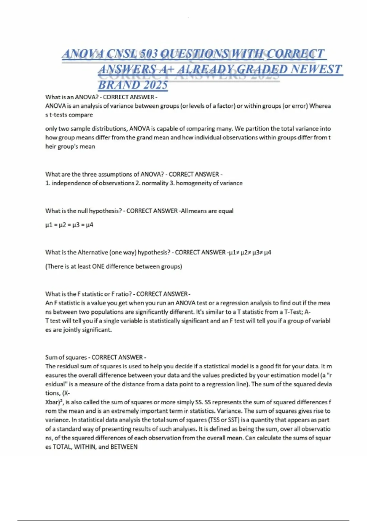 ANOVA CNSL 503 QUESTIONS WITH CORRECT ANSWERS A+ ALREADY GRADED NEWEST BRAND 2025 What is an ANOVA? - CORRECT ANSWER - ANOVA is an analysis of variance between groups (or levels of a factor) or within groups (or error) Wherea s t-tests compare only two sample distributions, ANOVA is capable of comparingkmany. We partition the total variance into how group means differ from the grand mean and how individual observations within groups differ from t heir group's mean Whatkare the three assumptions of ANOVA? - CORRECT ANSWER - 1. independence of observations 2. normality 3. homogeneity of variance What is the null hypothesis? - CORRECT ANSWER -All meanskare equal μ1 = μ2 = μ3 = μ4 Whatkis the Alternative (one way) hypothesis? - CORRECT ANSWER -μ1≠ μ2≠ μ3≠ μ4 (There is at least ONE difference between groups)