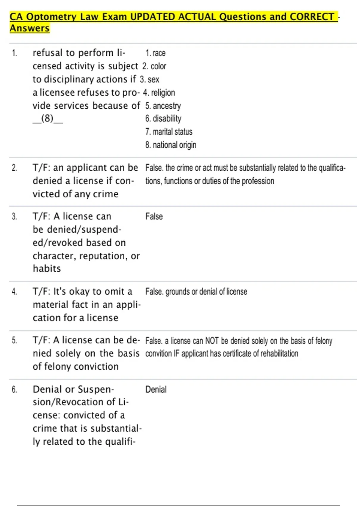 5. T/F: A license can be de- False. a license can NOT be denied solely on the basis of felony