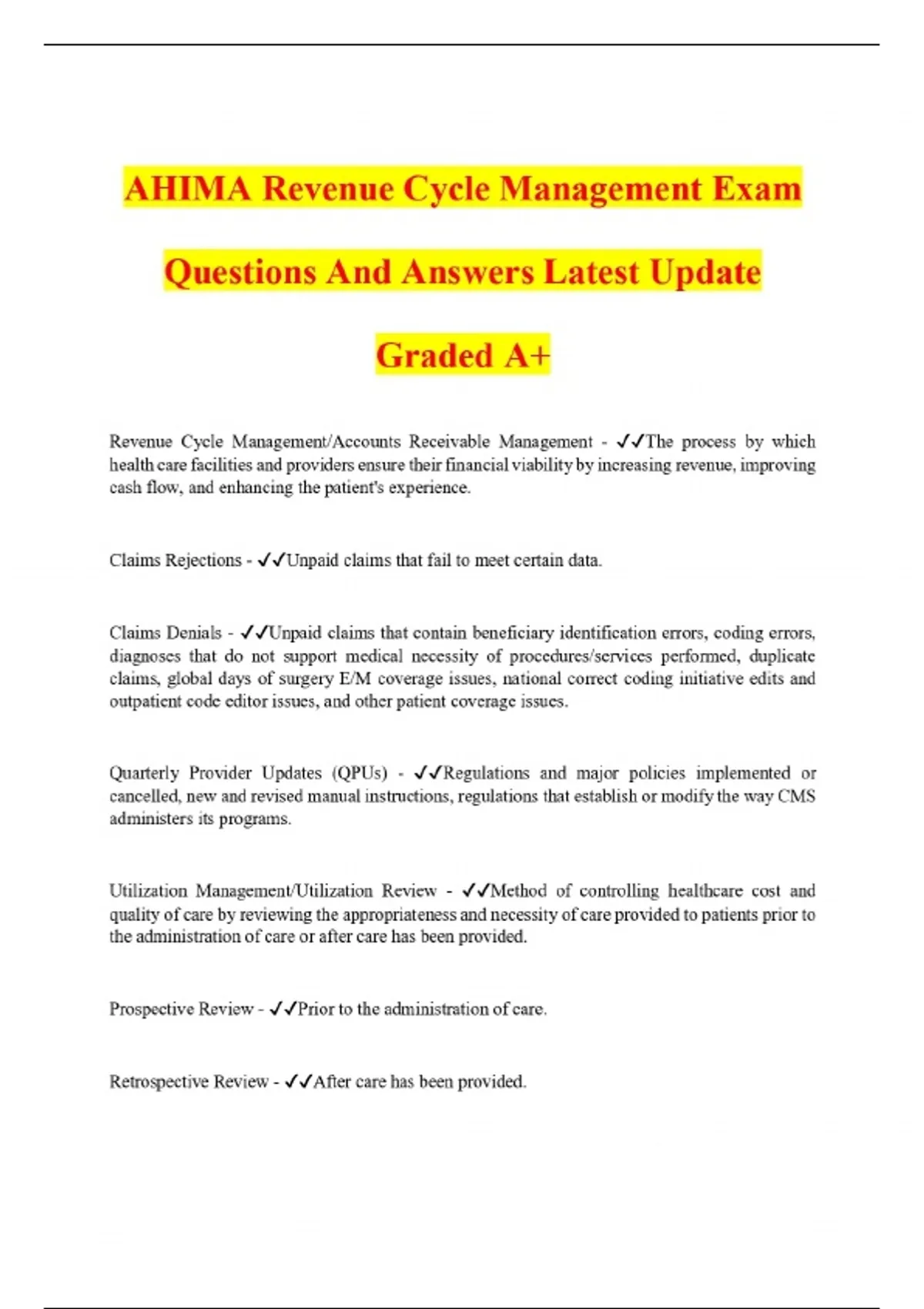 AHIMA Revenue Cycle Management Exam Questions And Answers Latest Update Graded A+