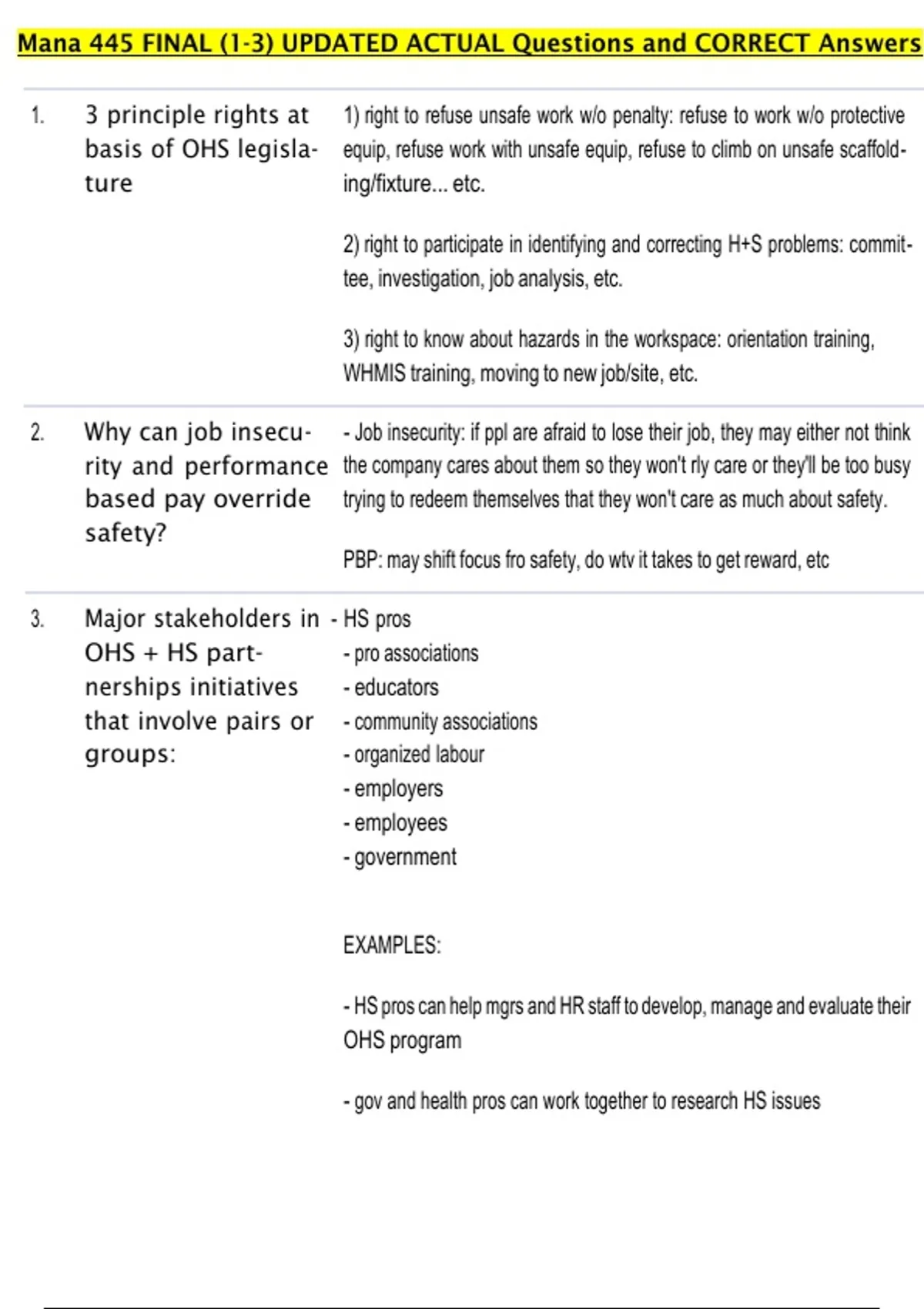 1. 3 principle rights at 1) right to refuse unsafe work w/o penalty: refuse to work w/o protective