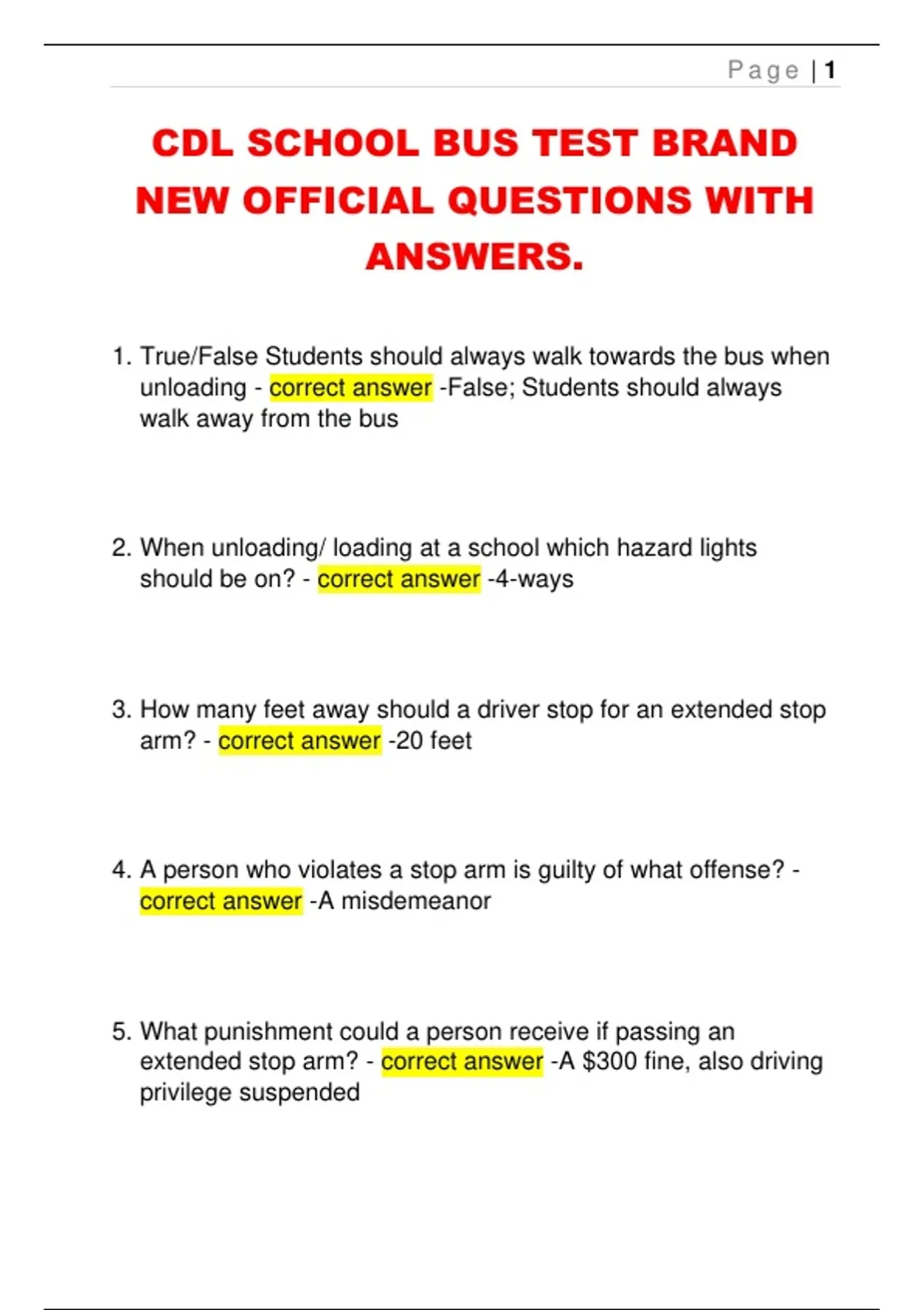 CDL SCHOOL BUS TEST BRAND NEW OFFICIAL QUESTIONS WITH ANSWERS.