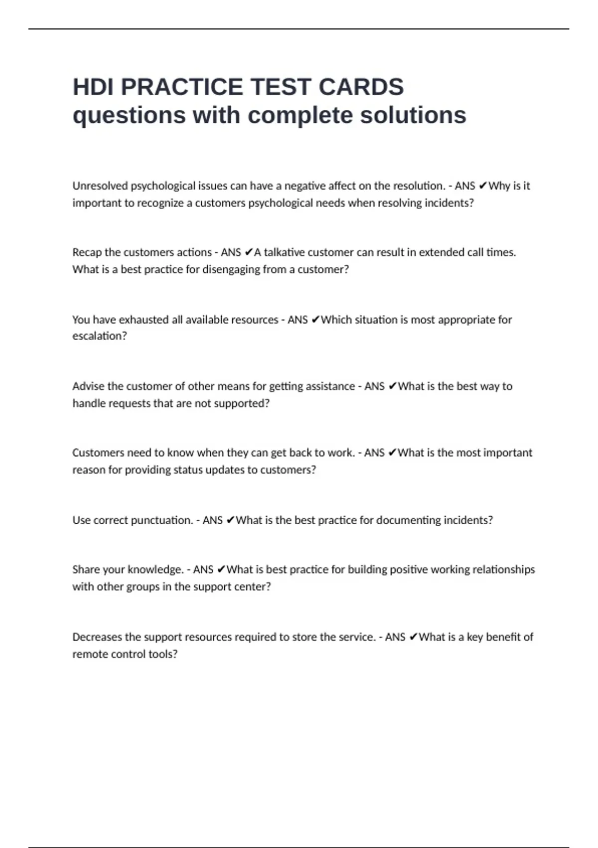 HDI PRACTICE TEST CARDS questions with complete solutions