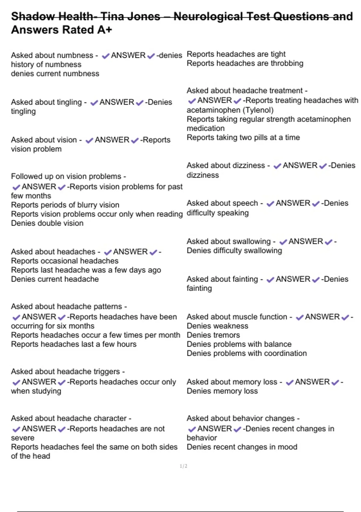 Shadow Health- Tina Jones – Neurological Test Questions and Answers Rated A+