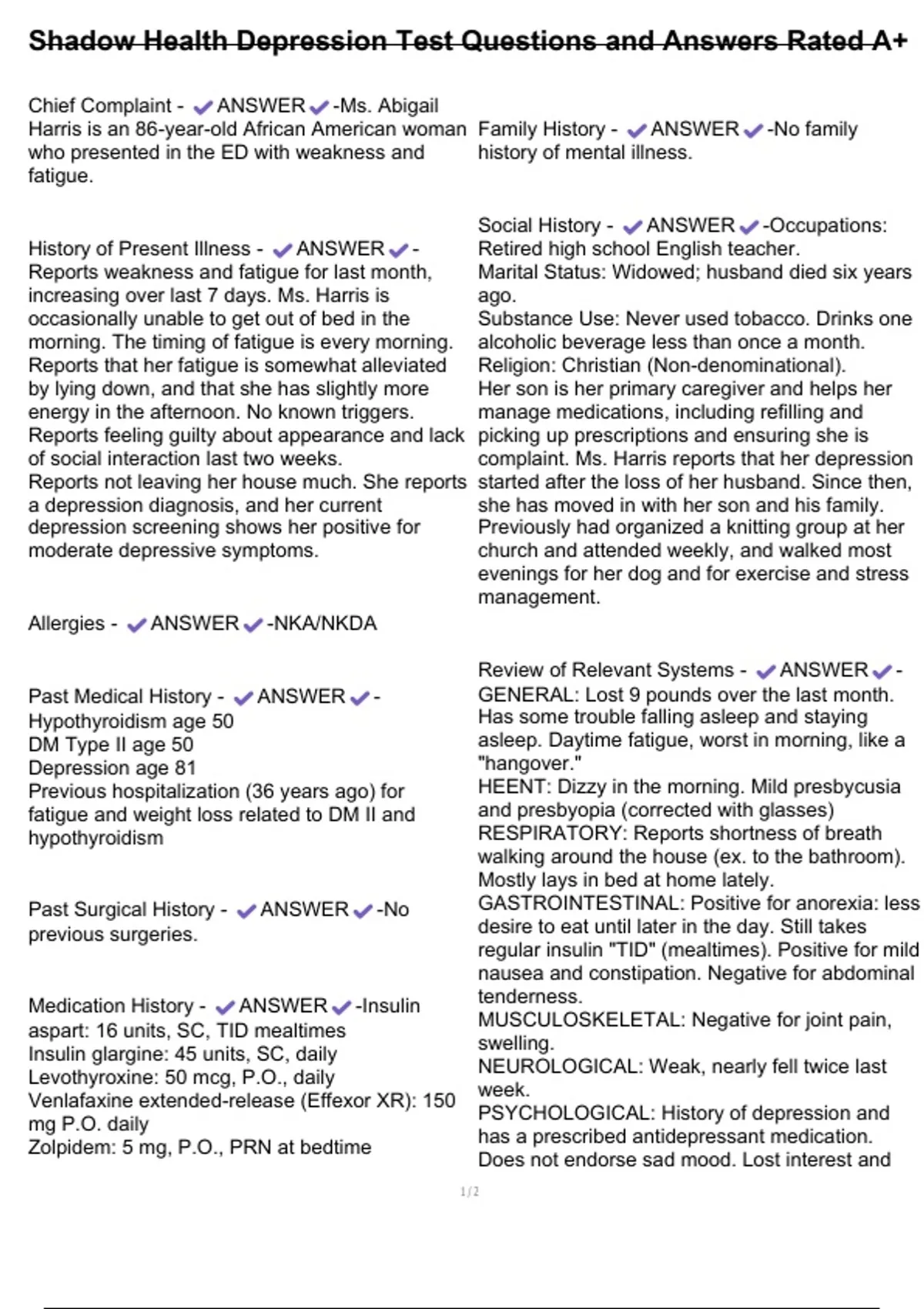 Harris is an 86-year-old African American woman Family History - ANSWER -No family