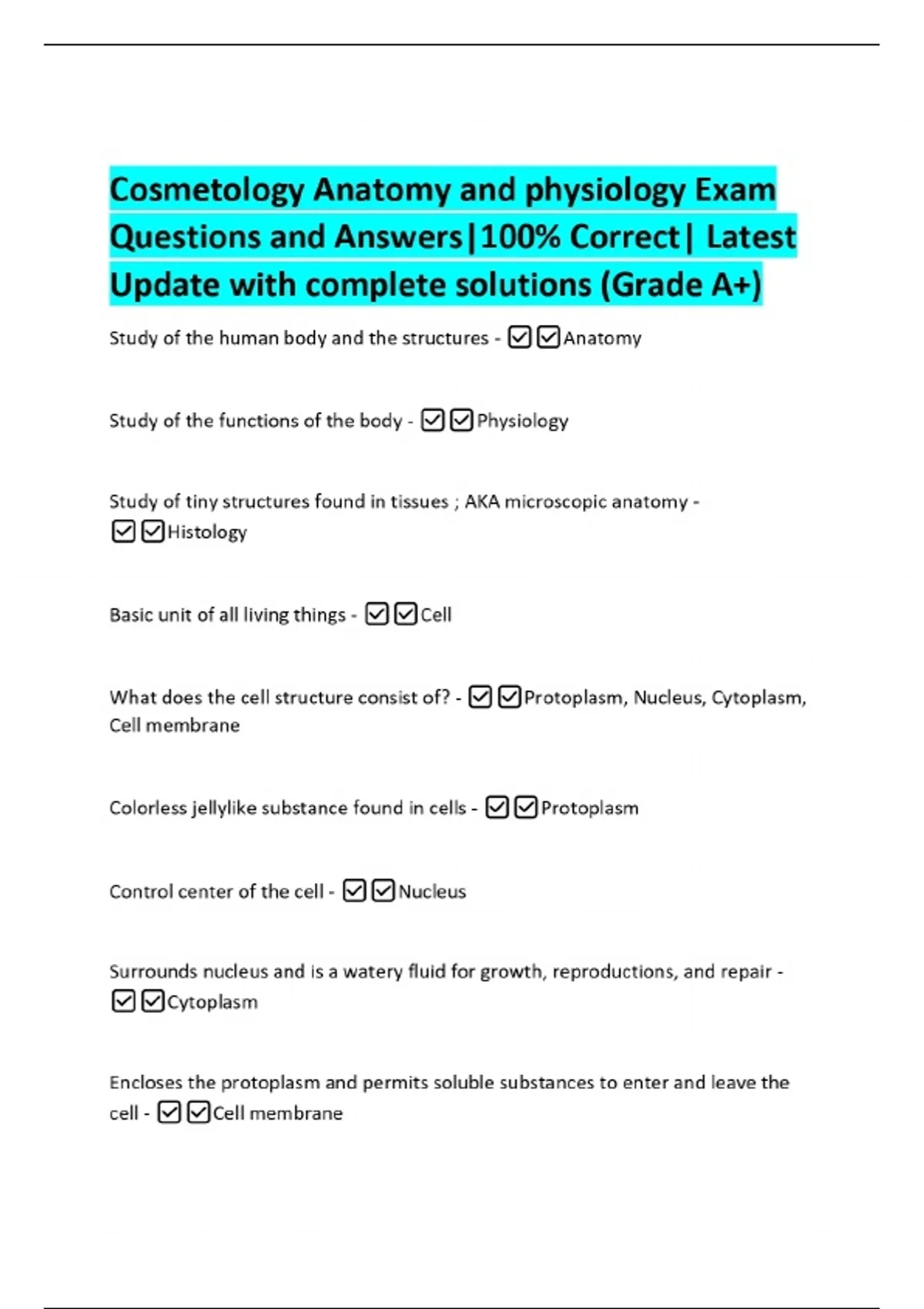 Cosmetology Anatomy and physiology Exam Questions and Answers|100% Correct| Latest Update with complete solutions (Grade A+) Study of the human body and the structures - Anatomy Study of the functions of the body - Physiology Study of tiny structures found in tissues ; AKA microscopic anatomy - Histology Basic unit of all living things - Cell What does the cell structure consist of? - Protoplasm, Nucleus, Cytoplasm, Cell membrane