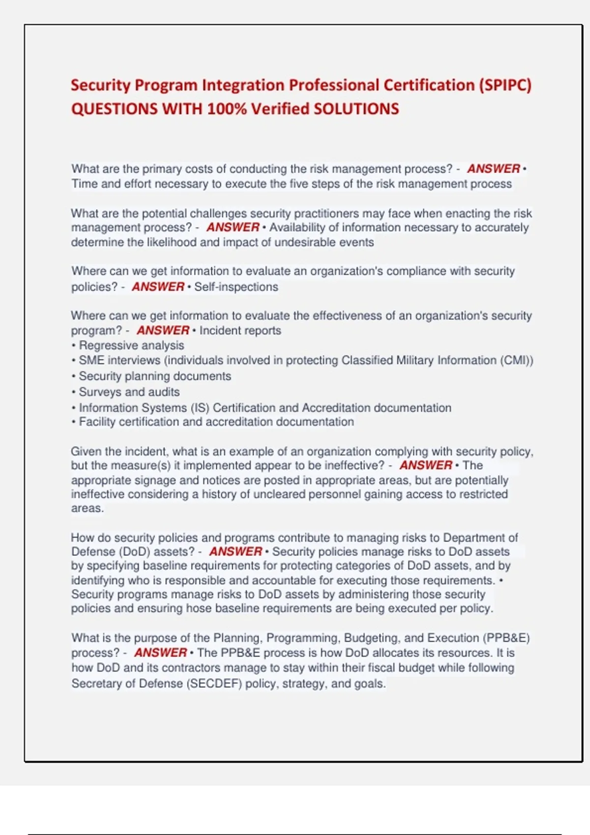 Security Program Integration Professional Certification (SPIPC) QUESTIONS WITH 100% Verified SOLUTIONS What are the primary costs of conducting the risk management process? - ANSWER • Time and effort necessary to execute the five steps of the risk management process What are the potential challenges security practitioners may face when enacting the risk management process? - ANSWER • Availability of information necessary to accurately determine the likelihood and impact of undesirable events Where can we get information to evaluate an organization's compliance with security policies? - ANSWER • Self-inspections Where can we get information to evaluate the effectiveness of an organization's security program? - ANSWER • Incident reports • Regressive analysis • SME interviews (individuals involved in protecting Classified Military Information (CMI)) • Security planning documents • Surveys and audits • Information Systems (IS) Certification and Accreditation documentation • Facility certification and accreditation documentation Given the incident, what is an example of an o