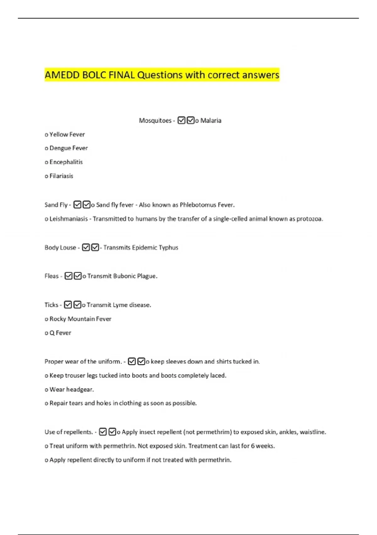 AMEDD BOLC FINAL Questions with correct answers Mosquitoes - o Malaria o Yellow Fever o Dengue Fever o Encephalitis o Filariasis Sand Fly - o Sand fly fever - Also known as Phlebotomus Fever. o Leishmaniasis - Transmitted to humans by the transfer of a single-celled animal known as protozoa. Body Louse - - Transmits Epidemic Typhus Fleas - o Transmit Bubonic Plague. Ticks - o Transmit Lyme dise
