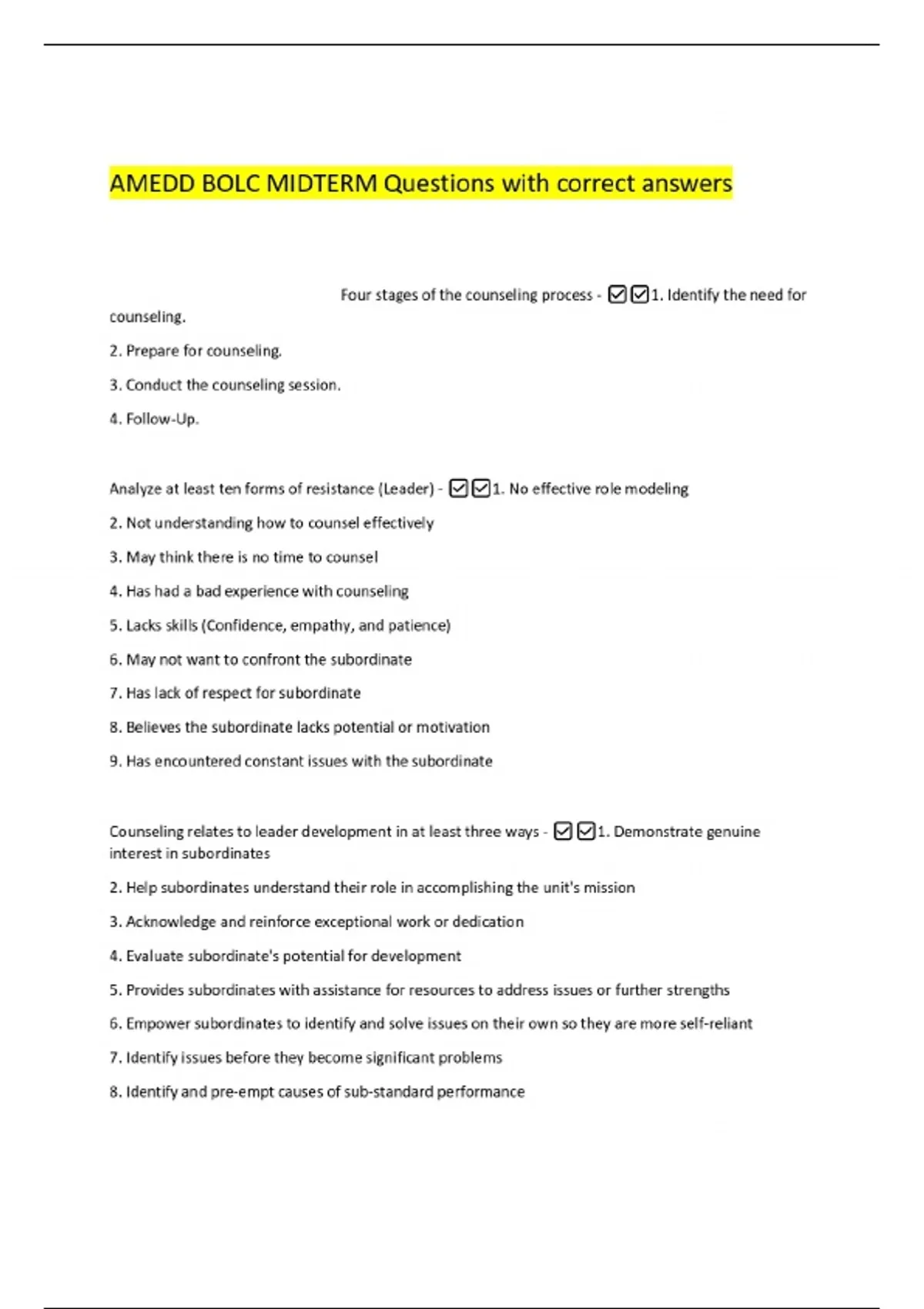 AMEDD BOLC MIDTERM Questions with correct answers Four stages of the counseling process - 1. Identify the need for counseling. 2. Prepare for counseling. 3. Conduct the counseling session. 4. Follow-Up. Analyze at least ten forms of resistance (Leader) - 1. No effective role modeling 2. Not understanding how to counsel effectively 3. May think there is no time to counsel 4. Has had a bad experience with counseling 5. Lacks skills (Confidence, empathy, and patience) 6. May not want to con