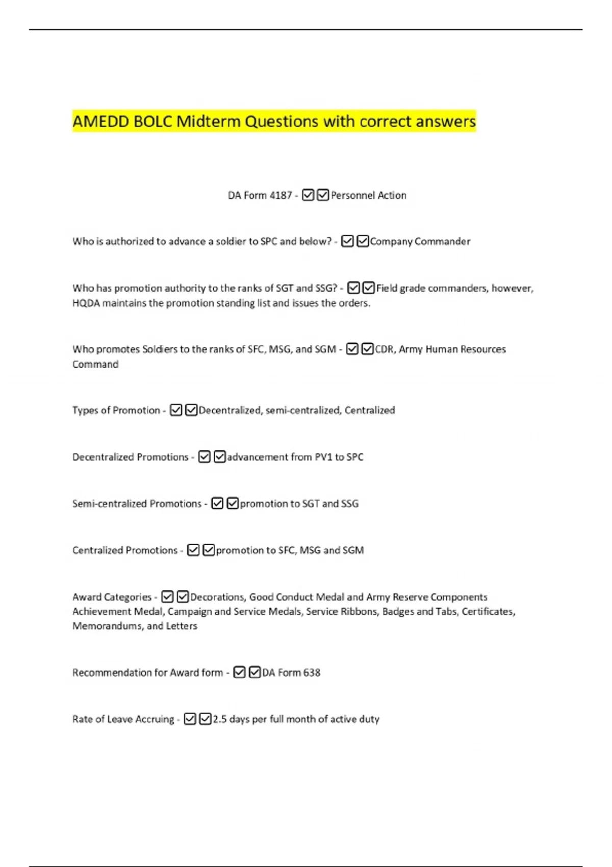 AMEDD BOLC Midterm Questions with correct answers