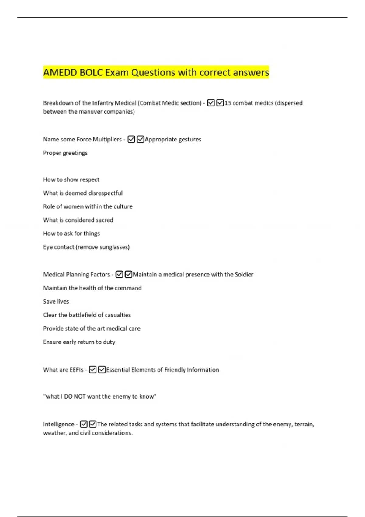 AMEDD BOLC Exam Questions with correct answers Breakdown of the Infantry Medical (Combat Medic section) - 15 combat medics (dispersed between the manuver companies) Name some Force Multipliers - Appropriate gestures Proper greetings How to show respect What is deemed disrespectful Role of women within the culture What is considered sacred How to ask for things Eye contact (remove sunglasses) Medical Planning Factors - Maintain a medical presence with the Soldier Maintain the health of the com