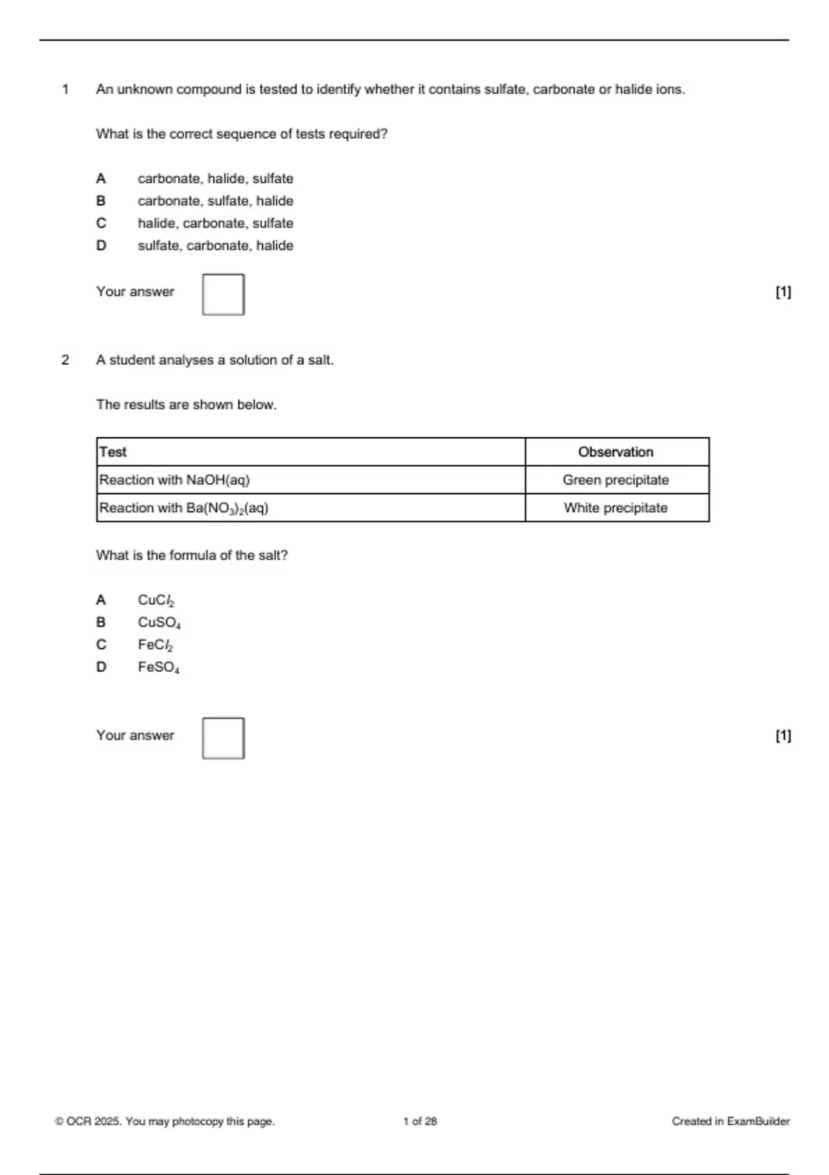 1 An unknown compound is tested to identify whether it contains sulfate, carbonate or halide ions.