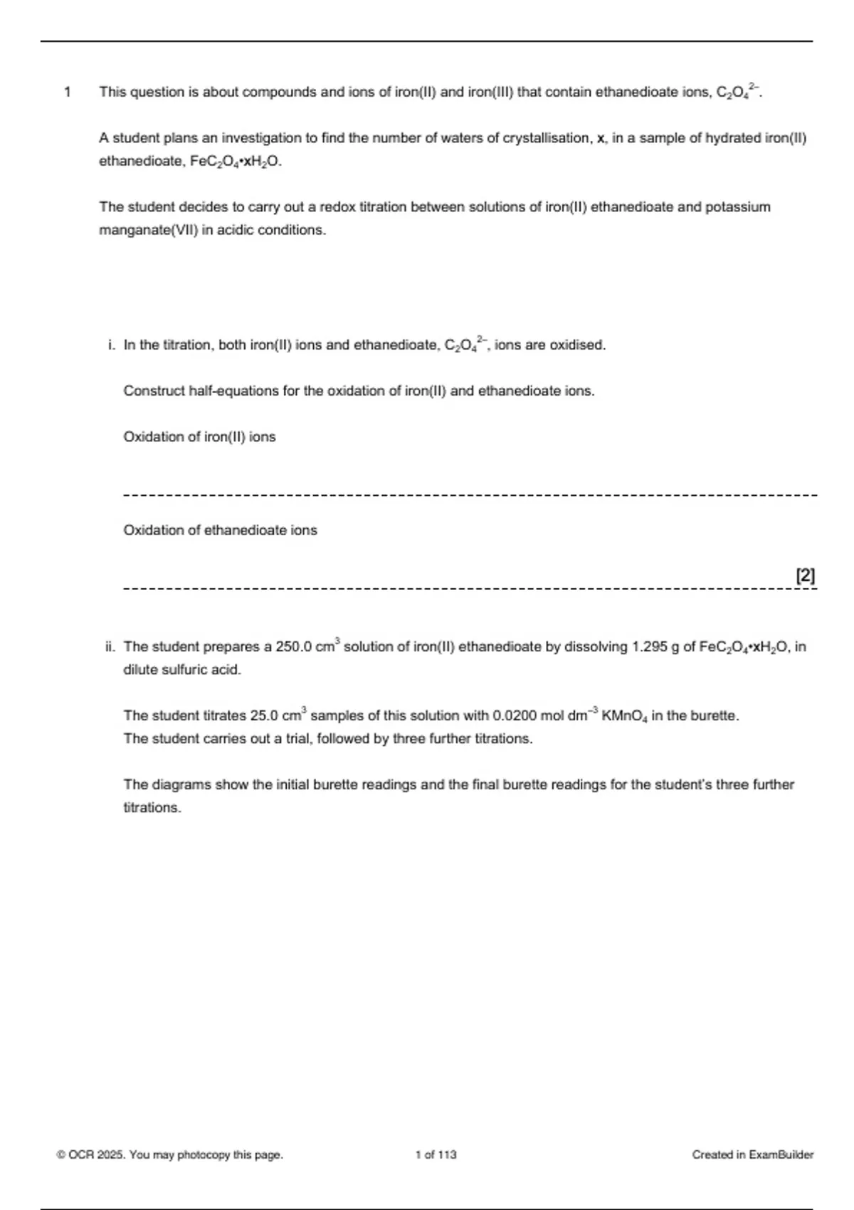 i. In the titration, both iron(II) ions and ethanedioate, C2O42–, ions are oxidised.