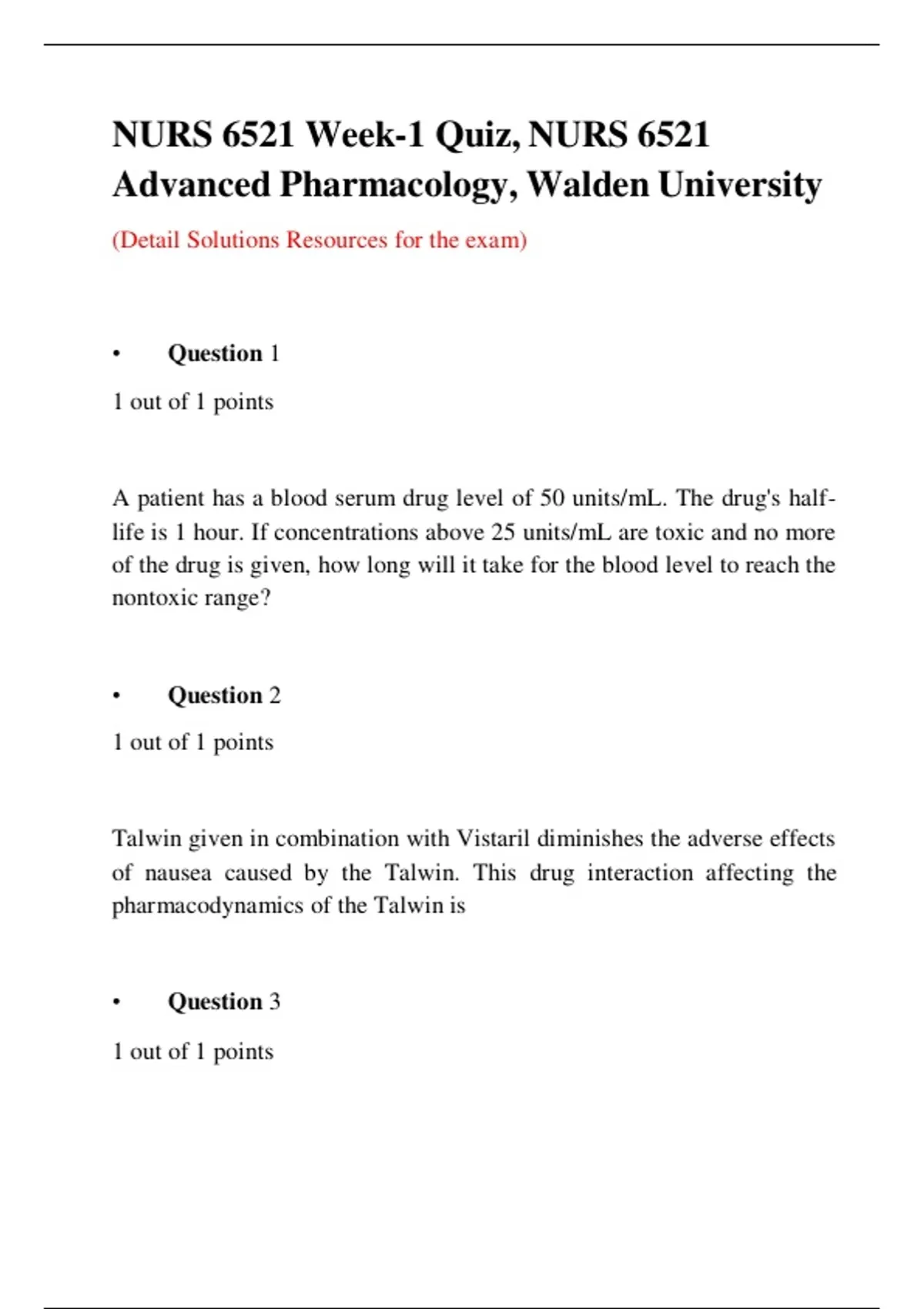Get the complete NURS 6521 Week 1 Quiz answers for Advanced Pharmacology at Walden University. Covers drug half-life, pharmacodynamics, protein binding, geriatric considerations, and safe medication administration.