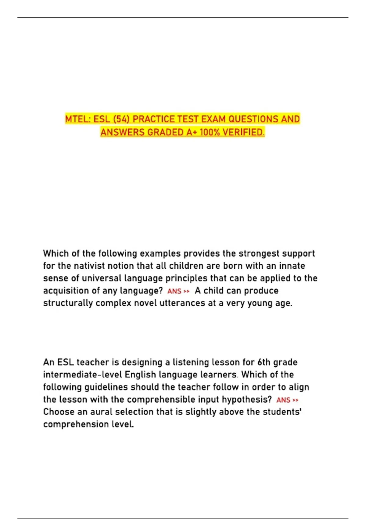 This document provides the complete MTEL ESL (54) Practice Test questions and 100% verified, graded A+ answers, fully updated for 2025. It covers all domains of the English as a Second Language (ESL) exam, including language and literacy development, instruction and assessment, cultural and linguistic diversity, and professional responsibilities. Each question mirrors the official MTEL format, offering a realistic and effective preparation tool for teacher candidates pursuing ESL certification in Massachusetts.