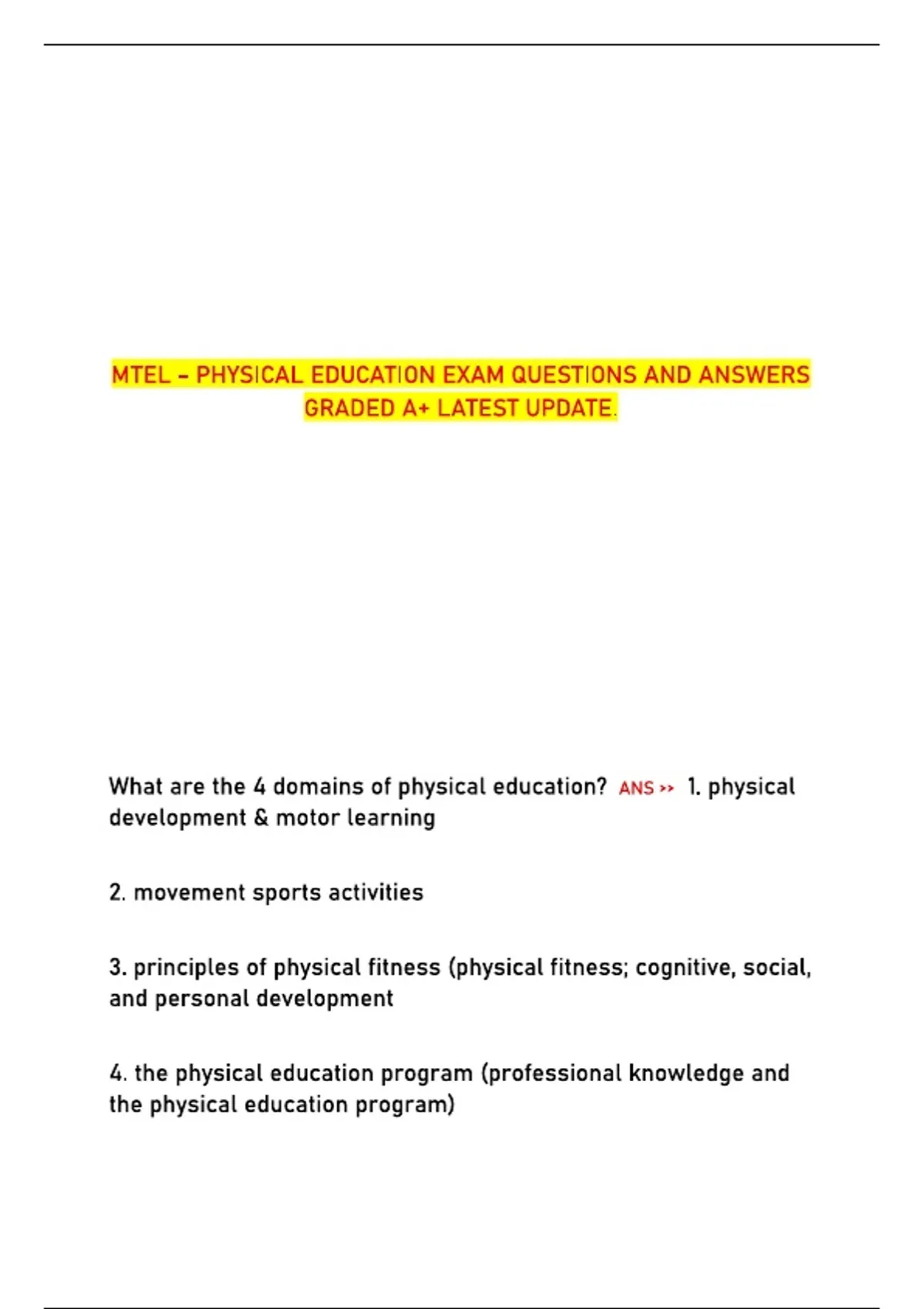 This document contains the full set of MTEL Physical Education Exam questions and correctly graded A+ answers, updated for 2025. It covers all key content areas of the MTEL Physical Education test, including growth and motor development, movement concepts, physical fitness, health education, instructional strategies, and professional responsibilities. Each question reflects the official MTEL exam structure, making this resource ideal for teacher candidates preparing for physical education certification in Massachusetts.