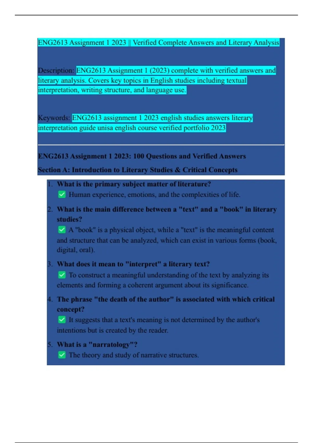 ENG2613 Assignment 1 2023 || Verified Complete Answers and Literary Analysis Description: ENG2613 Assignment 1 (2023) complete with verified answers and literary analysis. Covers key topics in English studies including textual interpretation, writing structure, and language use. Keywords: ENG2613 assignment 1 2023 english studies answers literary interpretation guide unisa english course verified portfolio 2023