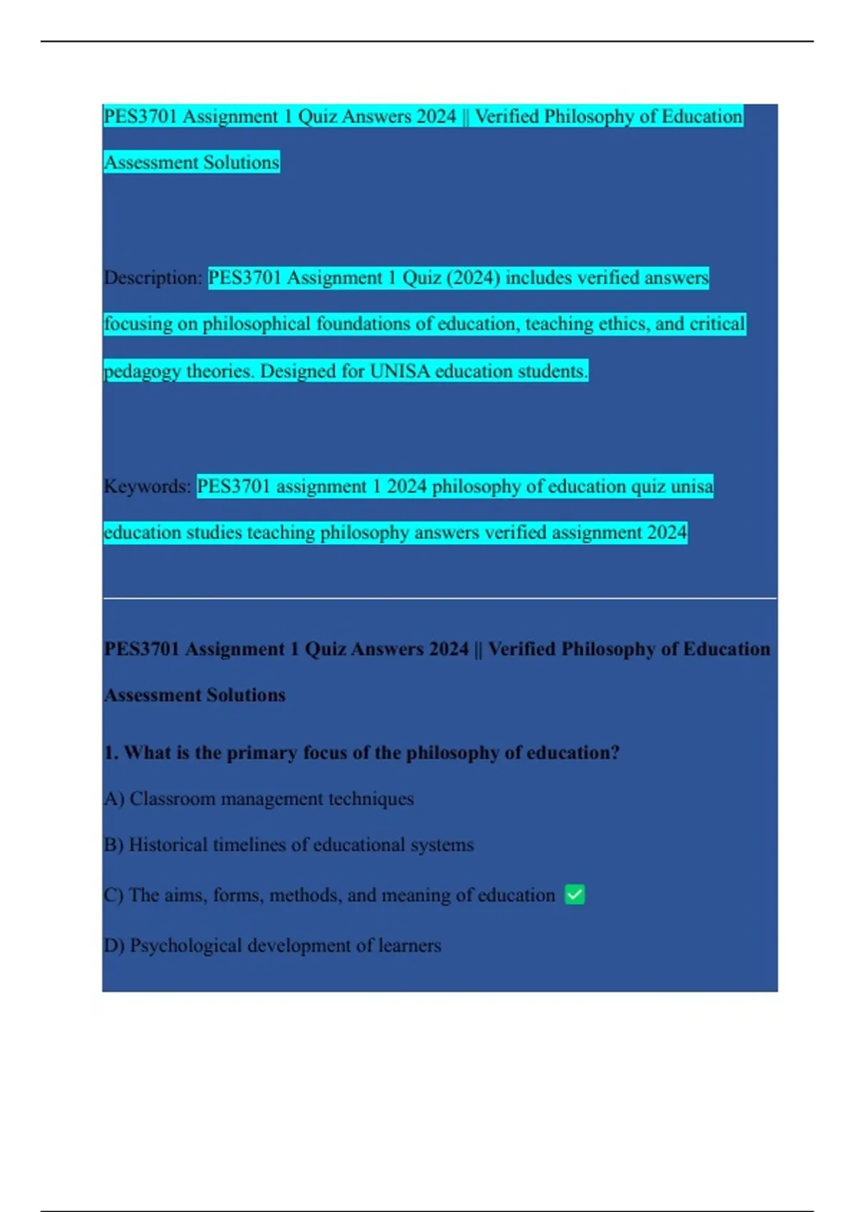PES3701 Assignment 1 Quiz Answers 2024 || Verified Philosophy of Education Assessment Solutions Description: PES3701 Assignment 1 Quiz (2024) includes verified answers focusing on philosophical foundations of education, teaching ethics, and critical pedagogy theories. Designed for UNISA education students. Keywords: PES3701 assignment 1 2024 philosophy of education quiz unisa education studies teaching philosophy answers verified assignment 2024
