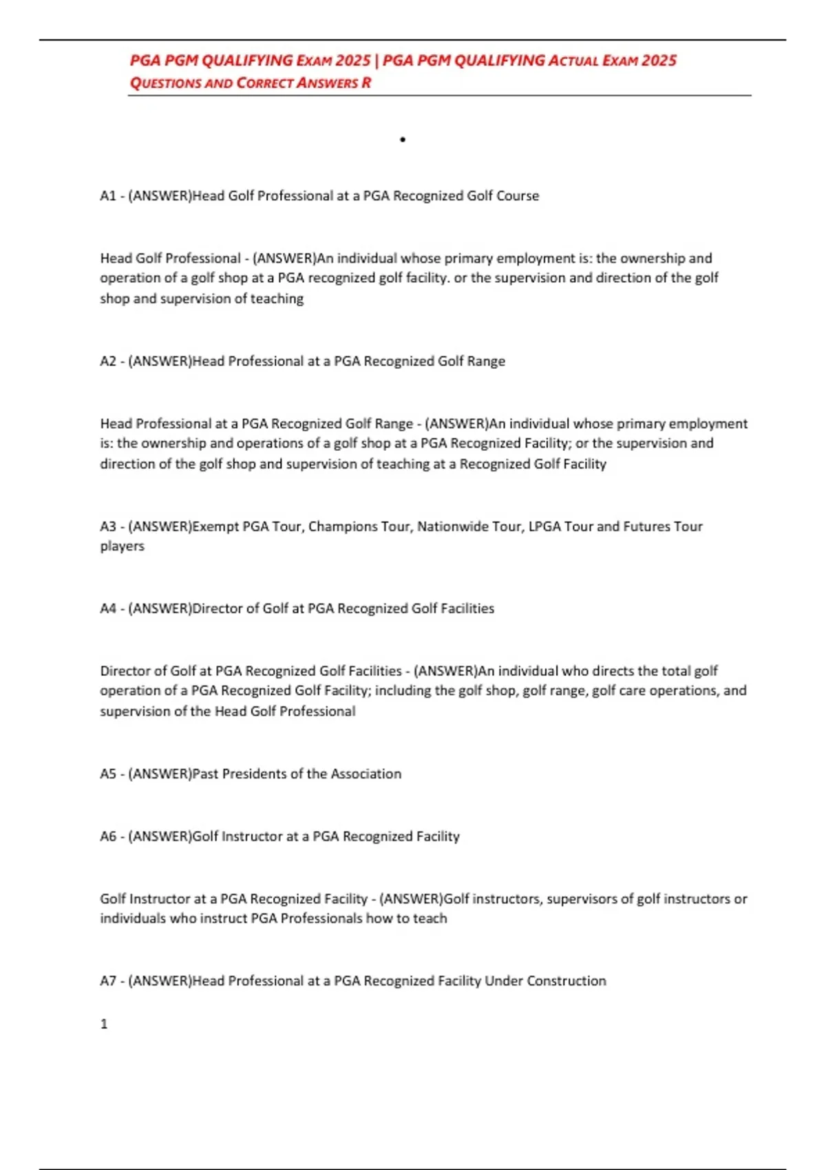 A1 - (ANSWER)Head Golf Professional at a PGA Recognized Golf Course