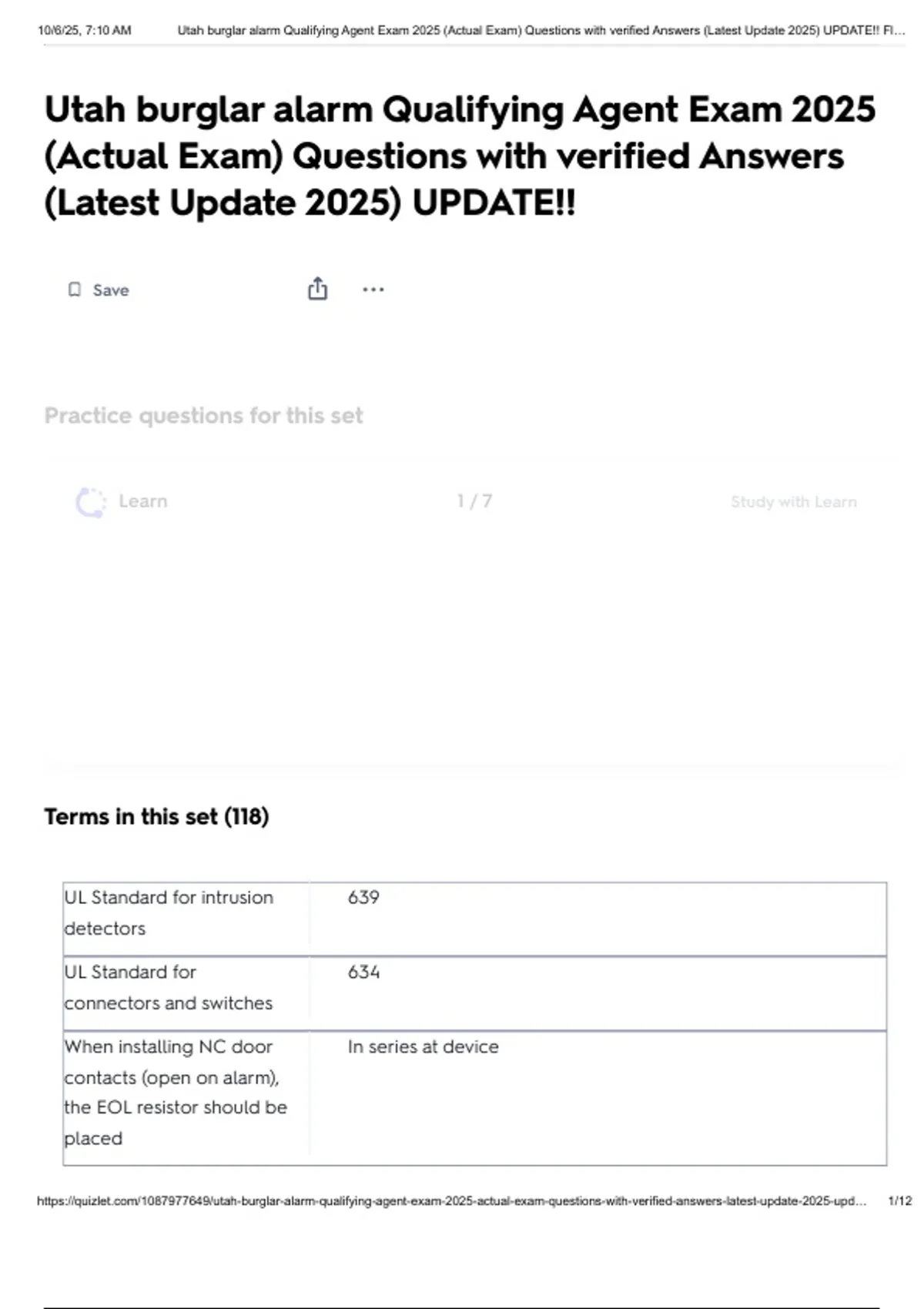 , 10/6/25, 7:10 AM Utah burglar alarm Qualifying Agent Exam 2025 (Actual Exam) Questions with verified Answers (Latest Update 2025) UPDATE!! Fl…