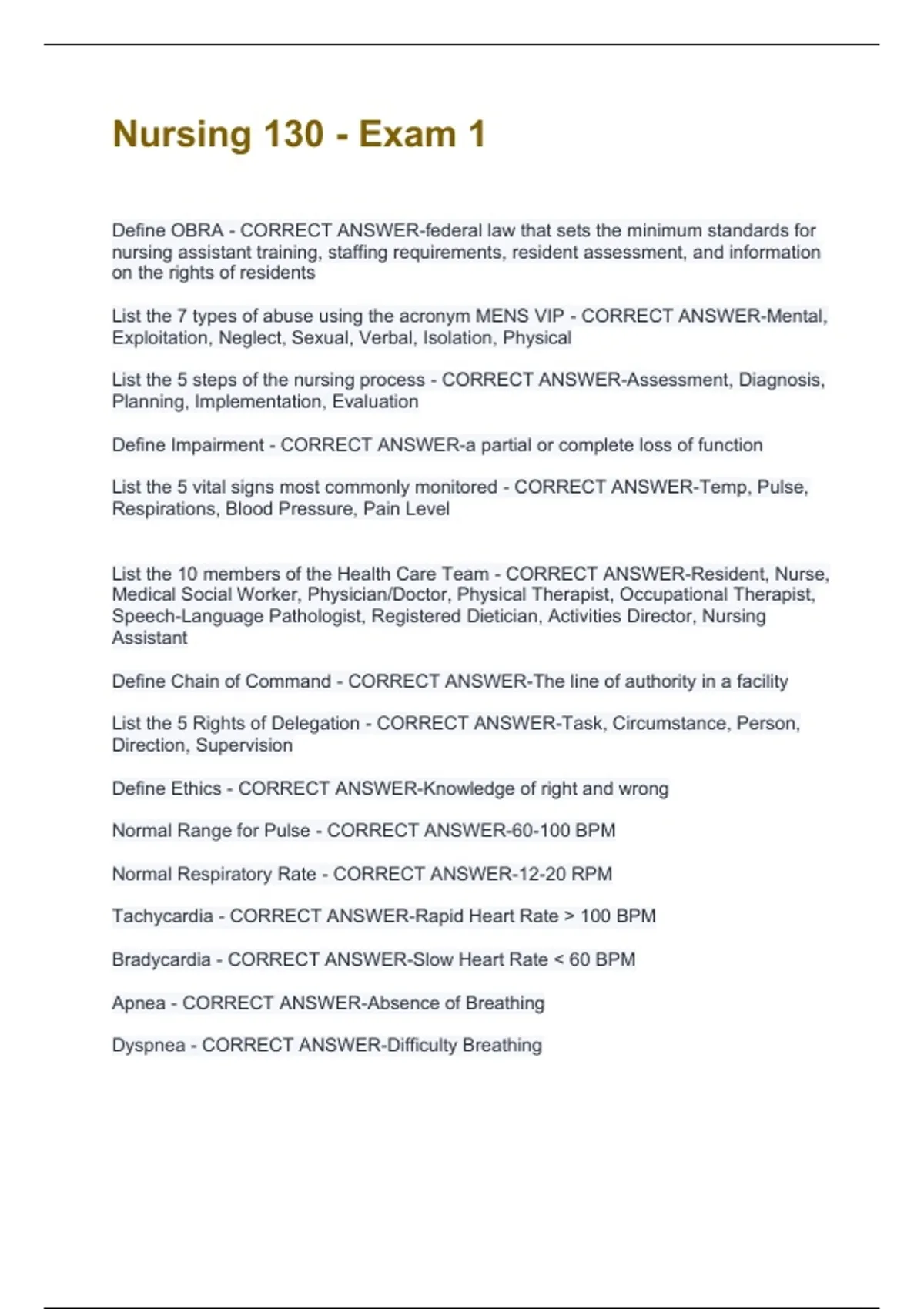 List the 5 vital signs most commonly monitored - CORRECT ANSWER-Temp, Pulse,