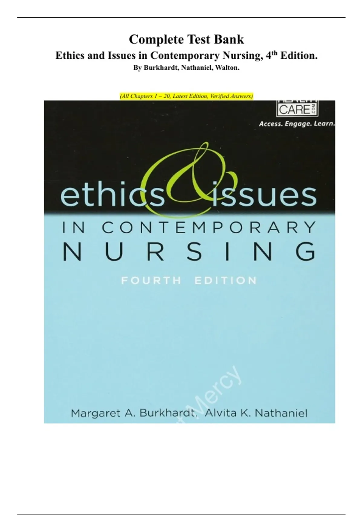 Complete Test Bank Ethics and Issues in Contemporary Nursing, 4th Edition. By Burkhardt, Nathaniel, Walton. (All Chapters 1 – 20, Latest Edition, Verified Answers) ETHICS & ISSUES IN CONTEMPORARY NURSING, 4th Edition examines the latest trends, principles, theories, and models in patient care to help you make ethically sound decisions in complex and often controversial situations. Acknowledging an ever-expanding global society, compelling examples are presented from national and international headlines that invite readers to explore the cases in light of socio-cultural influences, personal values, and professional ethics. Historical examples demonstrate how to think critically through various problems while upholding moral and professional standards, as well as the law. Key topics include patient advocacy and rights, diversity, medication error prevention, health care information management, portability and accountability, and health care reform. In addition to in-book learning features like analysis problems, review questions, sample forms, and appendices, ETHICS & ISSUES IN CONTEMPORARY NURSING, 4th Edition offers supplemental, interactive tools to challenge you further, and prepare you for morally sound behavior in any health care setting.