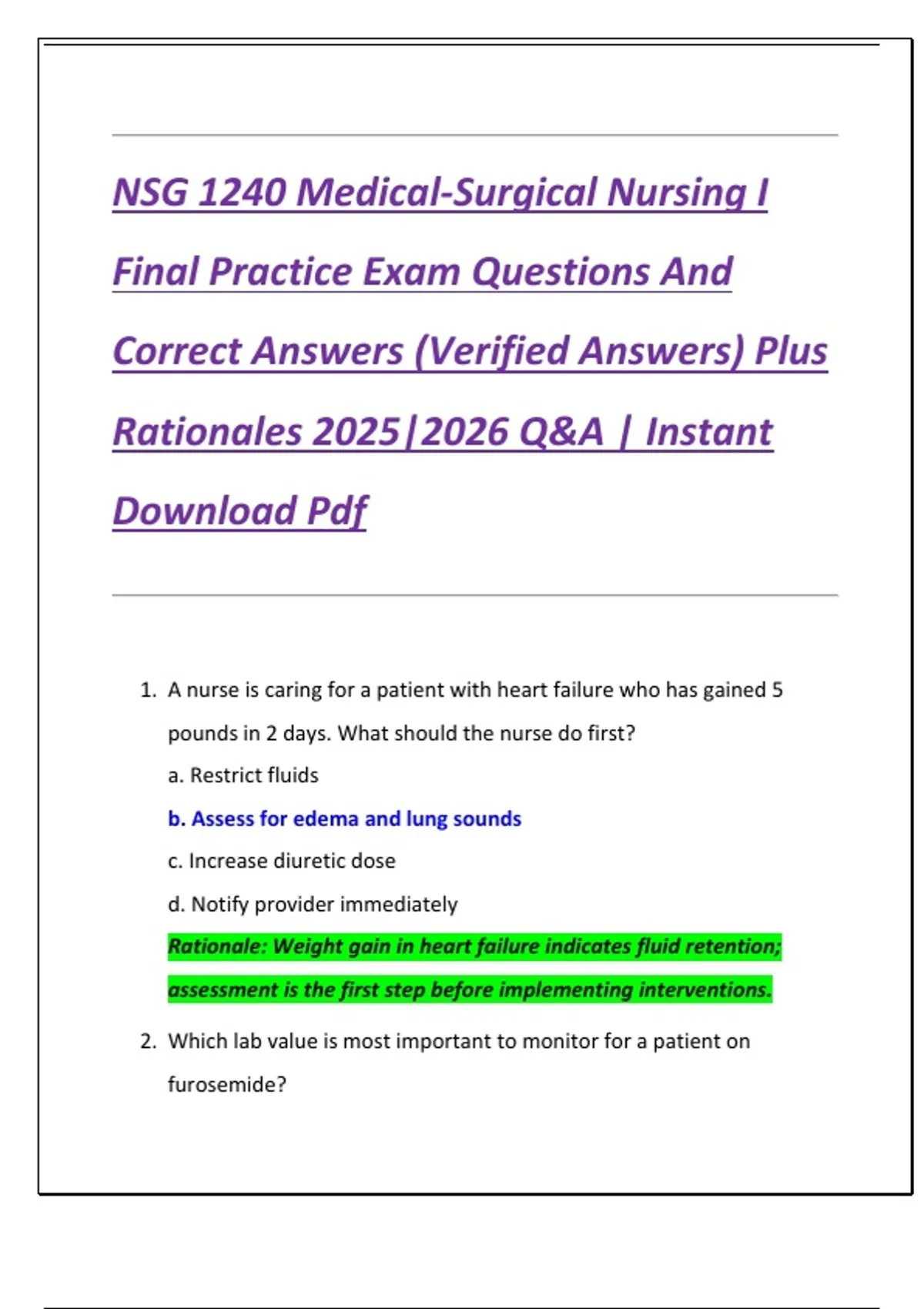 NSG 1240 Medical-Surgical Nursing I Final Practice Exam Questions And Correct Answers (Verified Answers) Plus Rationales 2025|2026 Q&A | Instant Download Pdf