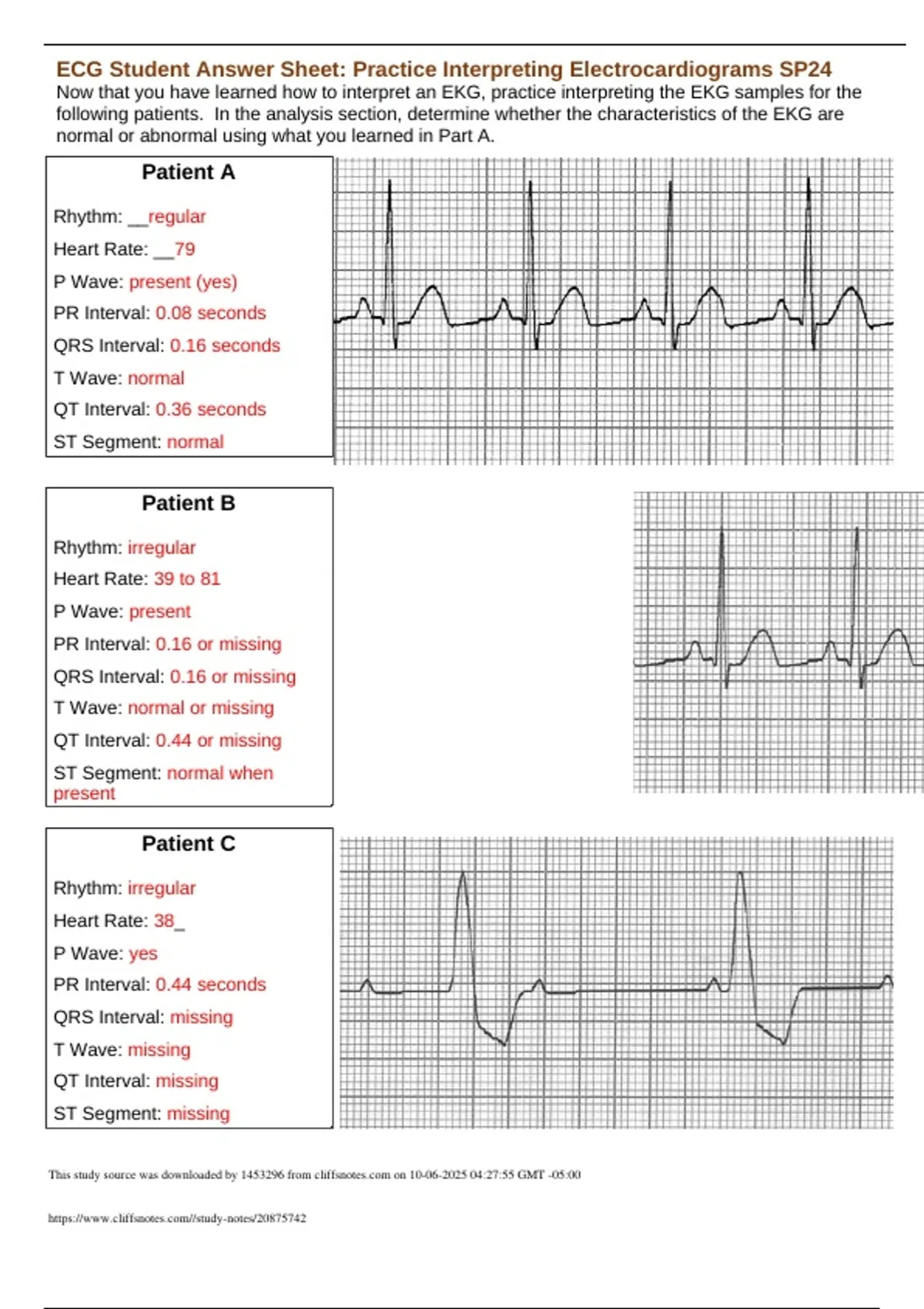 ECG Student Answer Sheet: Practice Interpreting Electrocardiograms SP24