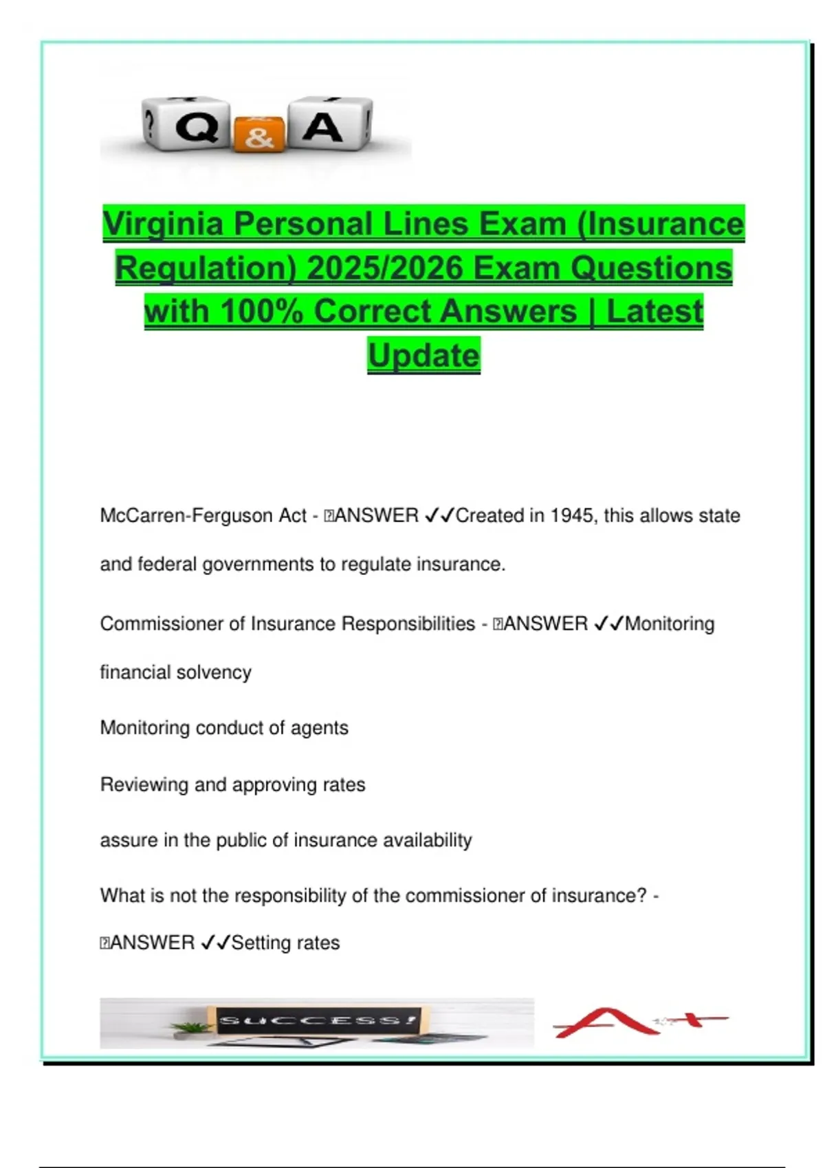 This document contains over 60 up-to-date, fully answered and verified questions specific to the Insurance Regulation section of the Virginia Personal Lines Agent Licensing Exam for the 2025/2026 academic year. Structured for optimal comprehension, this guide breaks down complex regulatory content into easy-to-understand exam-style questions and accurate answers aligned with current legal and policy frameworks in the Commonwealth of Virginia. The material thoroughly covers key topics such as: Responsibilities of the Insurance Commissioner Admitted vs Non-Admitted and Domestic, Foreign, Alien Insurers Surplus lines and distribution systems (exclusive agency, direct writer, independent agency) Key federal acts: McCarran-Ferguson, TRIA, CAN-SPAM, Gramm-Leach-Bliley Market conduct practices (e.g., rebating, twisting, defamation, coercion) Consumer protection plans like FAIR and Guaranty Plans This guide is especially beneficial for: Students in Risk Management, Business Law, Insurance, Public Administration, or Finance Professionals preparing for the Virginia Personal Lines Agent License Career switchers entering the insurance, financial services, or compliance industries With real exam terminology and relevant examples, this resource enhances both legal understanding and practical readiness. Whether used as a focused refresher or as a key study aid, it provides everything needed to master the insurance regulatory landscape required by Virginia licensing standards. Keywords: Virginia personal lines, insurance regulation, admitted insurers, surplus lines, TRIA, FAIR plan, insurance exam 2025, licensing questions, independent agency, direct writer, Gramm-Leach-Bliley Act, rebating, twisting, defamation, guaranty fund, state insurance law, agent authority