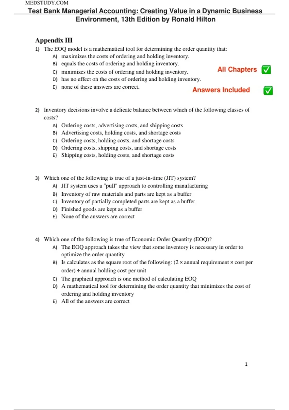 1) The EOQ model is a mathematical tool for determining the order quantity that: