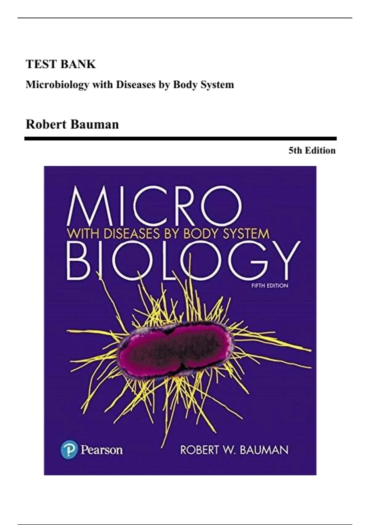 This document provides the complete test bank for Microbiology with Diseases by Body System (5th Edition) by Robert W. Bauman. It includes comprehensive, chapter-by-chapter multiple-choice, matching, and applied-concept questions with verified correct answers. Topics cover microbial structure and function, infection and immunity, disease mechanisms, host–pathogen interactions, and microbial control by body system. Ideal for microbiology, nursing, and allied health students preparing for exams or reinforcing key microbiological concepts.