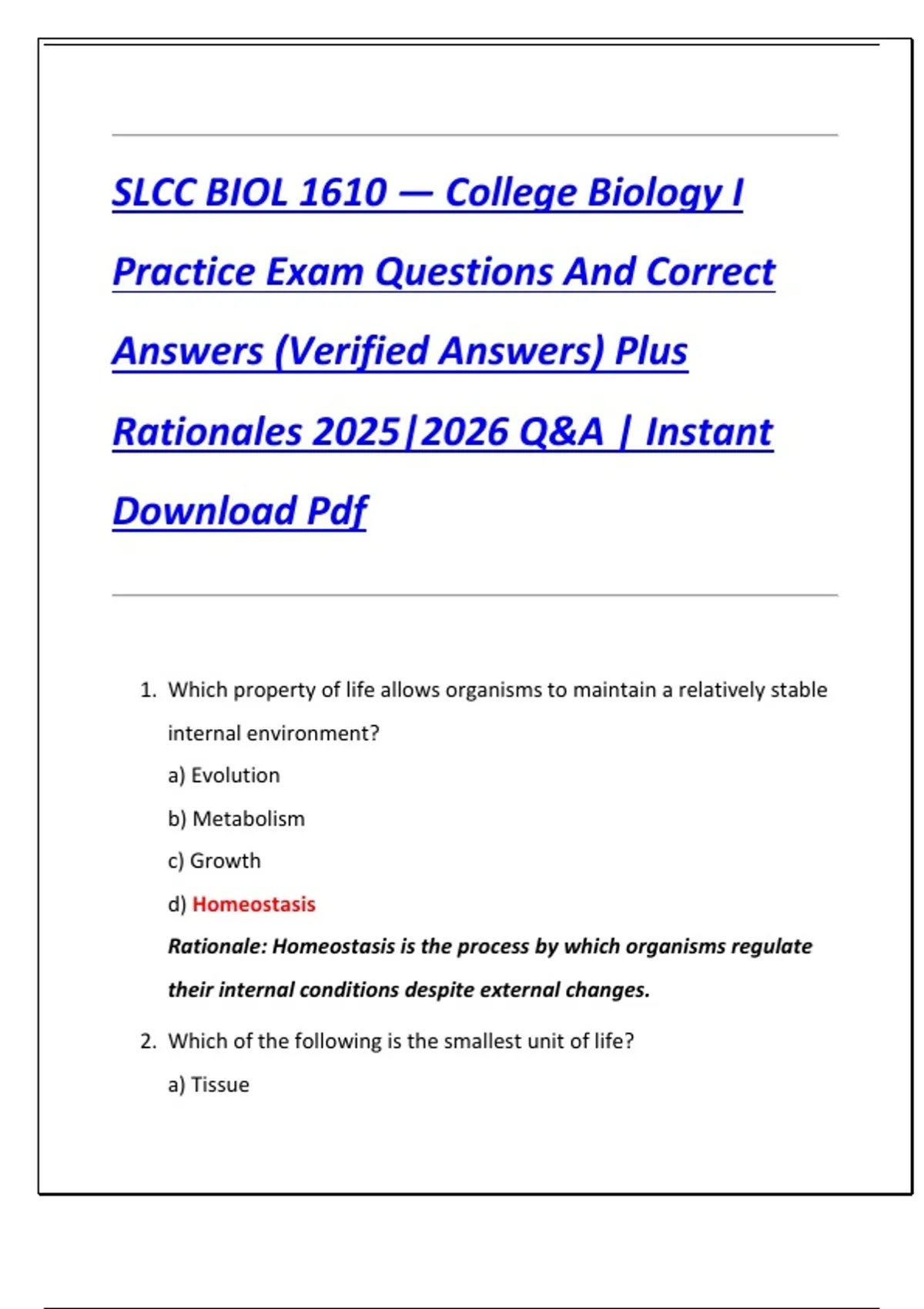 SLCC BIOL 1610 — College Biology I Practice Exam Questions And Correct Answers (Verified Answers) Plus Rationales 2025|2026 Q&A | Instant Download Pdf