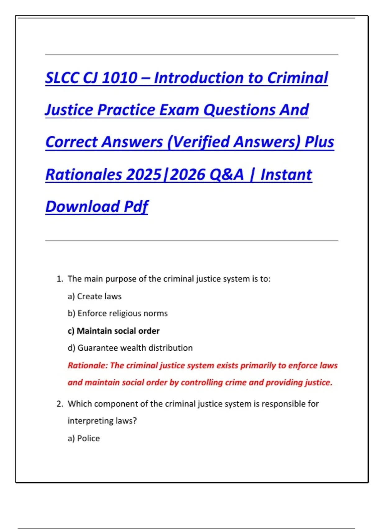 SLCC CJ 1010 – Introduction to Criminal Justice Practice Exam Questions And Correct Answers (Verified Answers) Plus Rationales 2025|2026 Q&A | Instant Download Pdf