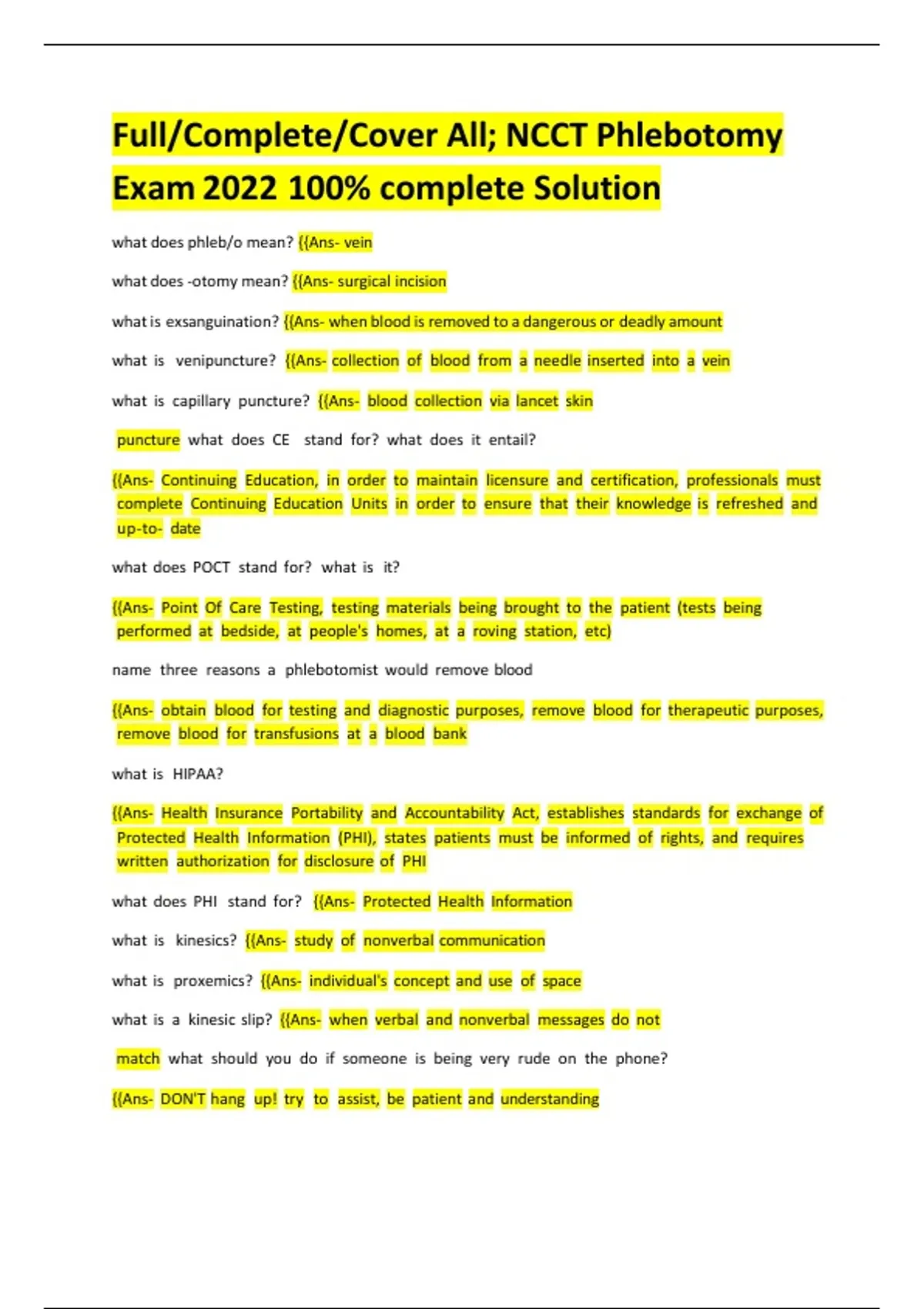 NCCT Phlebotomy Exam 2025 | Complete Study Guide & 100% Verified Solutions A+