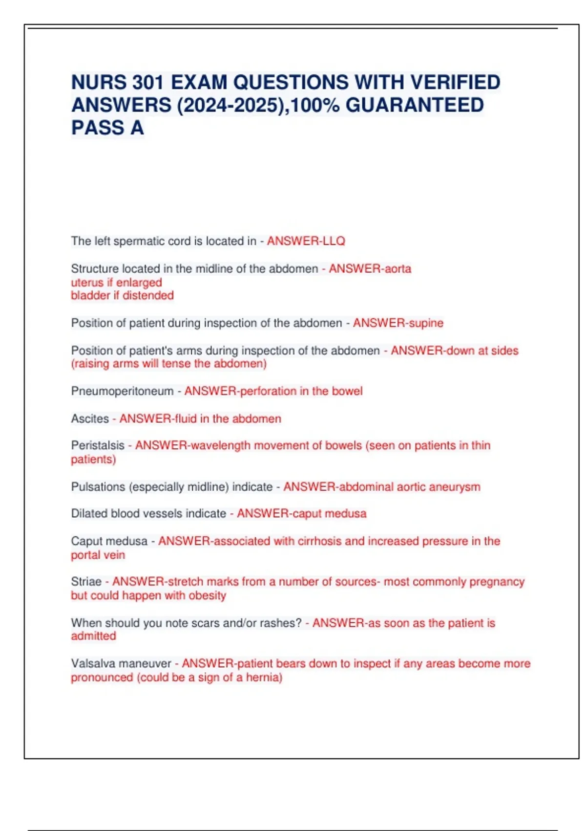 NURS 301 EXAM QUESTIONS WITH VERIFIED ANSWERS (),100% GUARANTEED PASS A The left spermatic cord is located in - ANSWER-LLQ Structure located in the midline of the abdomen - ANSWER-aorta uterus if enlarged bladder if distended Position of patient during inspection of the abdomen - ANSWER-supine Position of patient's arms during inspection of the abdomen - ANSWER-down at sides (raising arms will tense the abdomen) Pneumoperitoneum - ANSWER-perforation in the bowel Ascites - ANSWER-fluid in the abdomen Peristalsis - ANSWER-wavelength movement of bowels (seen on patients in thin patients) Pulsations (especially midline) indicate - ANSWER-abdominal aortic aneurysm Dilated blood vessels indicate - ANSWER-caput medusa Caput medusa - ANSWER-associated with cirrhosis and increased pressure in the portal vein Striae - ANSWER-stretch marks from a number of sources- most commonly pregnancy but could happen with obesity When should you note scars and/or rashes? - ANSWER-as soon as the patient is admitted Valsalva maneuver - ANSWER-patient bears down to inspect if any areas become more pronounced (could be a sign of a hernia) How is abdominal girth measured? - ANSWER-at the same time of day, after voiding and with the patient in the same position at the level of the umbilicus Auscultation is the ______ step for abdominal assessment due to the risk of disturbing the intestines with palpation and percussion which could cause sounds that were not really present but only present because of the disturbances - ANSWER-second What is the purpose of warming the stethoscope during auscultation of the abdomen? - ANSWER-decreases guarding or tensing of the abdominal muscles Should the bell or diaphragm of the stethoscope be used first for auscultation of the abdomen? - ANSWER-bell The bell of the stethoscope is used to listen midline over the abdominal aorta to auscultate for a ______. You may also auscultate right and left renal arteries, iliac and femoral arteries. - ANSWER-bruit The ________ of the stethoscope should be used to listen over the 4 quadrants for bowel sounds. - ANSWER-diaphragm Bowel sounds may be more prominent in the ___ - ANSWER-RUQ