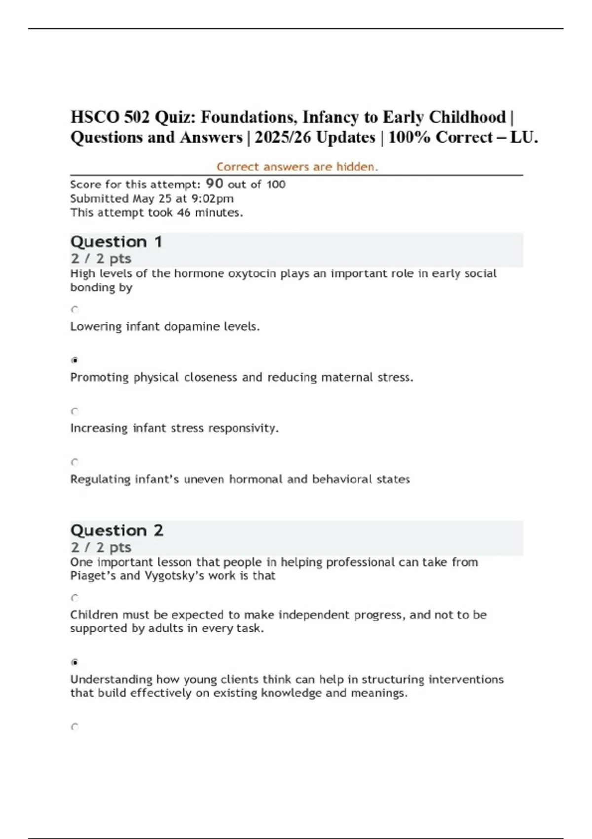 HSCO 502 Quiz: Foundations, Infancy to Early Childhood | Questions and Answers | 2025/26 Updates | 100% Correct – LU.