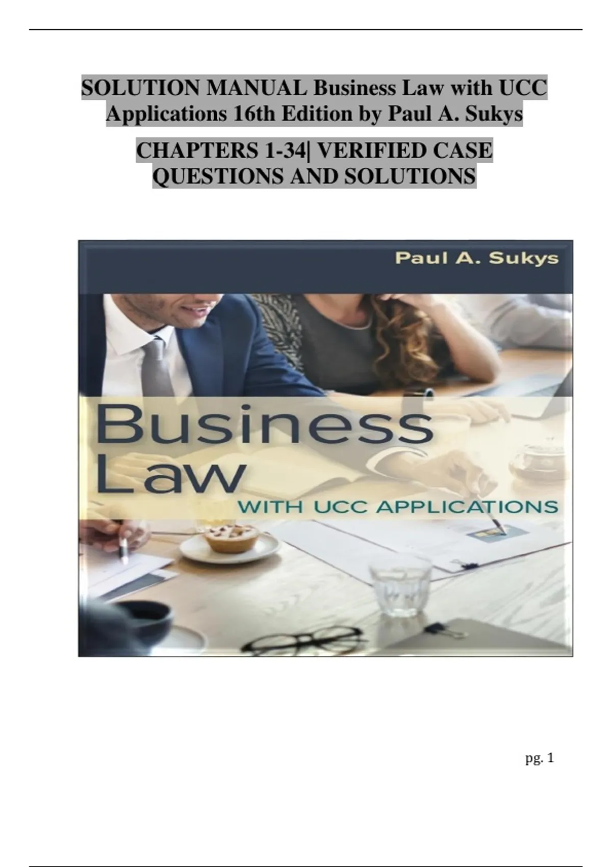 This comprehensive solution manual provides detailed answers and explanations for all 34 chapters of Business Law with UCC Applications, 16th Edition by Paul A. Sukys. It includes verified responses to case questions, review and discussion prompts, and ethical analysis exercises. The content covers major legal principles such as ethics, the judicial system, criminal and tort law, alternative dispute resolution, and the Uniform Commercial Code (UCC). Ideal for students and instructors seeking a complete reference for case-based learning and exam preparation in business law courses.
