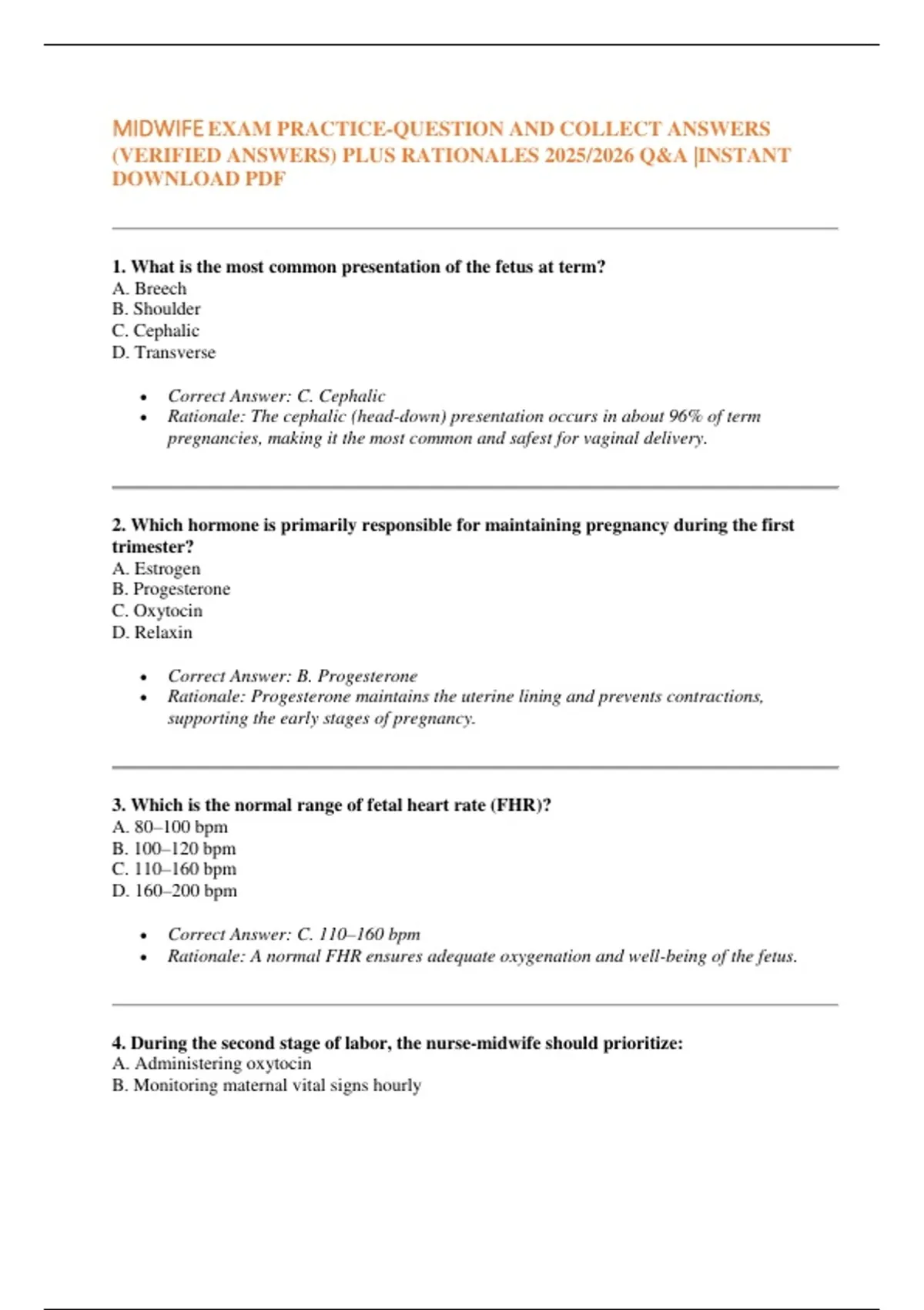 4. During the second stage of labor, the nurse-midwife should prioritize: