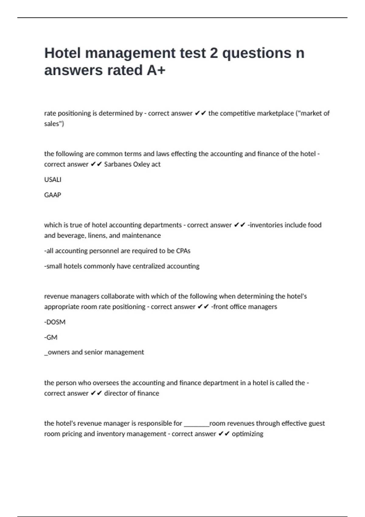 marketing is - correct answer ✔✔ used to increase a potential guest's awareness of the hotel