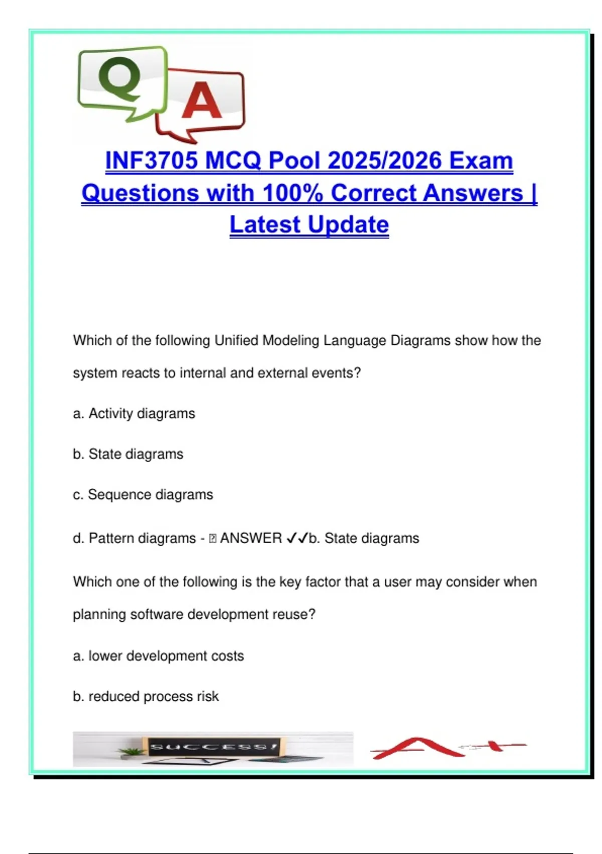 This document is a curated question pool of over 250 multiple-choice questions with correct answers for the module INF3705 – Software Engineering, aligned with the 2025/2026 academic year at the University of South Africa (UNISA). Designed to support exam preparation and deep understanding of software development principles, this collection targets both foundational and advanced topics in software engineering. Topics explored in this MCQ pool include: Requirements Engineering: Functional and non-functional requirements, elicitation techniques, user stories Software Design: Modular design, coupling and cohesion, interface specifications, architectural styles Software Reuse & Reengineering: Component-based design, software product lines, legacy systems Testing & Quality Assurance: Unit testing, integration testing, validation, verification, test-driven development Model-Driven Engineering & UML: Use case, activity, class, and sequence diagrams Software Process Models: Agile vs. plan-driven, incremental development, prototyping, formal specification Dependability and Maintenance: Fault tolerance, risk management, maintainability metrics Every question includes the correct answer clearly marked, offering a reliable self-assessment tool for students reviewing for semester tests or final exams. The structure of the document closely resembles UNISA's testing style, making it a valuable supplement to textbooks and lectures. Recommended for: INF3705 students at UNISA Software engineering and IT diploma students Open distance learners preparing for semester exams Candidates aiming to reinforce their knowledge of system design and testing Applicable courses or prep areas: INF3705 Software Engineering Software Design & Testing Requirements Analysis and System Modelling Advanced Software Development Techniques Keywords: INF3705, software engineering, UNISA, MCQ pool, software testing, requirements engineering, design patterns, software reuse, modular design, UML diagrams, SDLC, agile development, formal methods, integration testing, software quality assurance