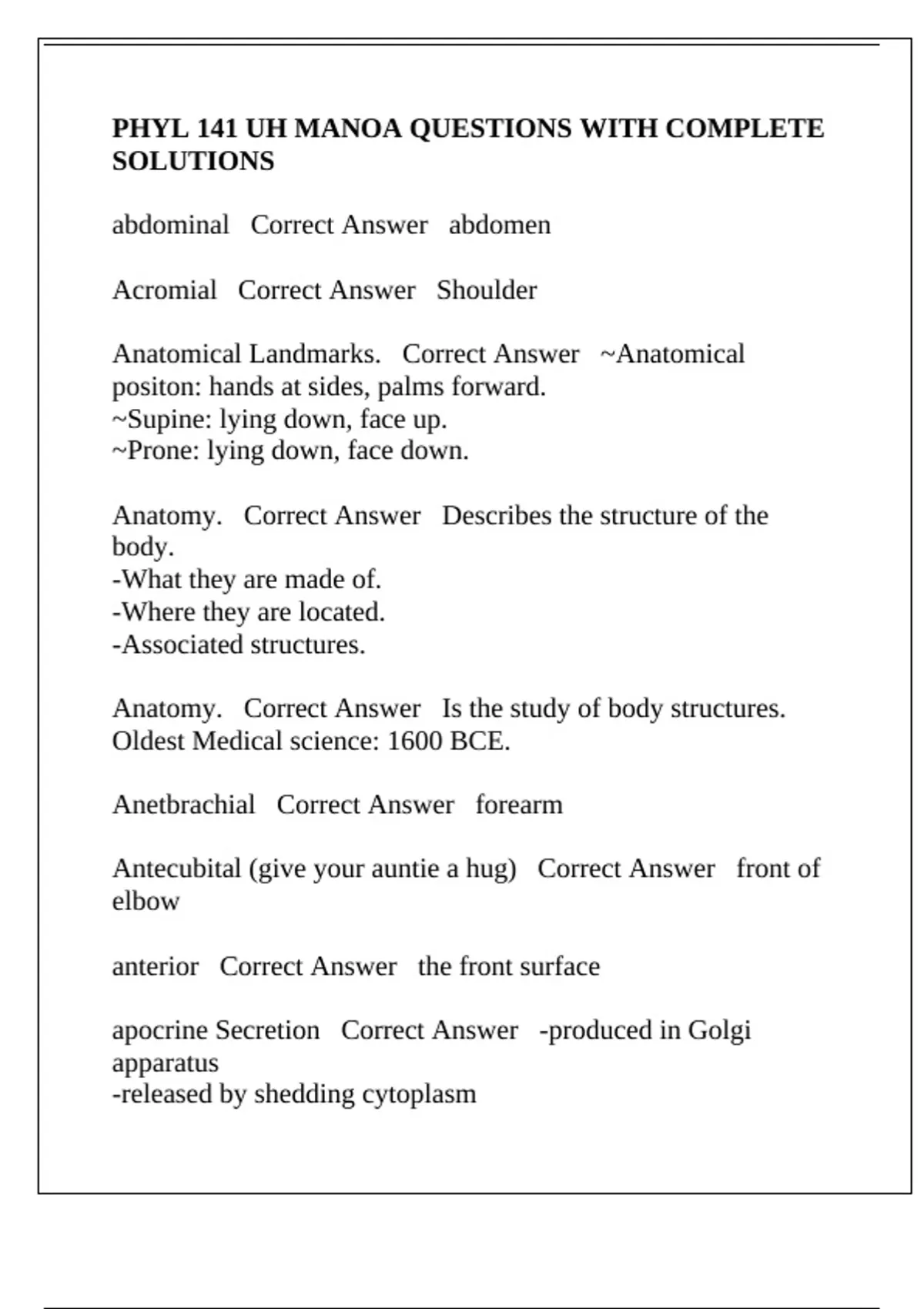 PHYL 141 UH MANOA QUESTIONS WITH COMPLETE SOLUTIONS