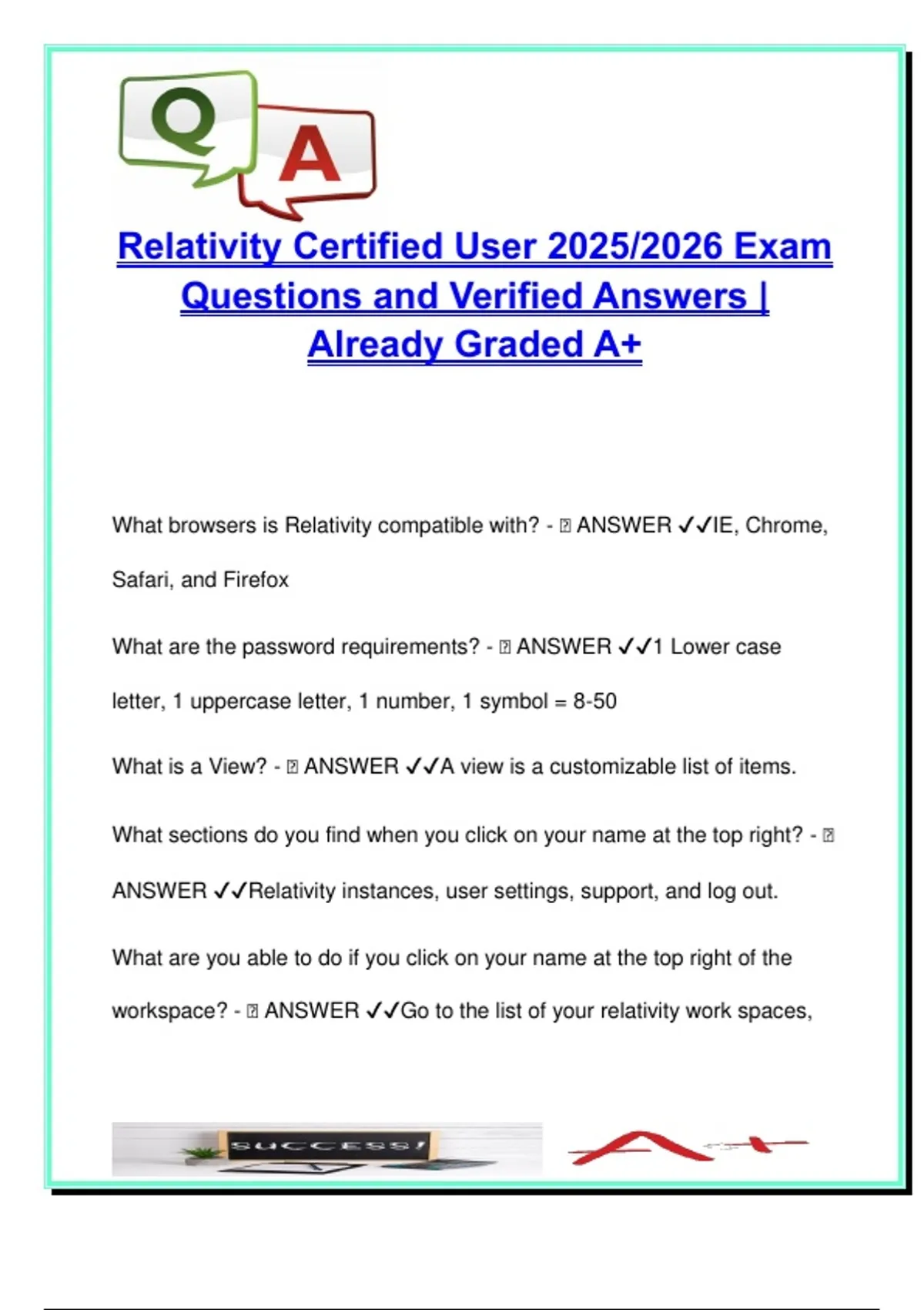 This document provides a complete and well-structured collection of 80+ solved questions and answers for the Relativity Certified User Exam, based on the 2025/2026 certification standards. Designed to prepare users for the official RelativityOne end-user certification, this guide focuses on practical skills used in daily legal tech operations, especially around document review and data analysis. Organized in a straightforward Q&A format, this resource helps users build confidence by mimicking the exam’s structure, including interface navigation, search logic, and visual analysis tools. Key topics include: Navigation and personalization: user settings, quick nav, and favorites Workspace management: folders, saved searches, and browser panel use Views and filters: how to customize document lists, sort orders, and visibility Email threading and inclusivity: black/white squares, duplicates, reply chains Textual near-duplicate analysis: principals, similarity %, group identification Document comparison: visual differences, red/blue text highlights Batch review workflows and coding panels Pivot analysis: group by/pivot on fields, charts, export options, profile management All answers are verified and reflect the latest RelativityOne interface and certification guide, ensuring relevance for both exam success and on-the-job application. This document is ideal for: Law firm staff, paralegals, and litigation support professionals Legal data reviewers and analysts Corporate legal departments using RelativityOne eDiscovery professionals aiming for entry-level certification Training coordinators preparing teams for platform onboarding Whether you're new to Relativity or need a refresher before certification, this guide delivers everything you need to master the end-user tools in RelativityOne. Keywords: Relativity user exam 2025, RelativityOne certified user, email threading, views and filters, pivot profiles, saved searches, document review tools, textual near duplicates, coding panel, batch review, legal tech certification, eDiscovery platform, relativity filters, comparison tool, user settings relativity