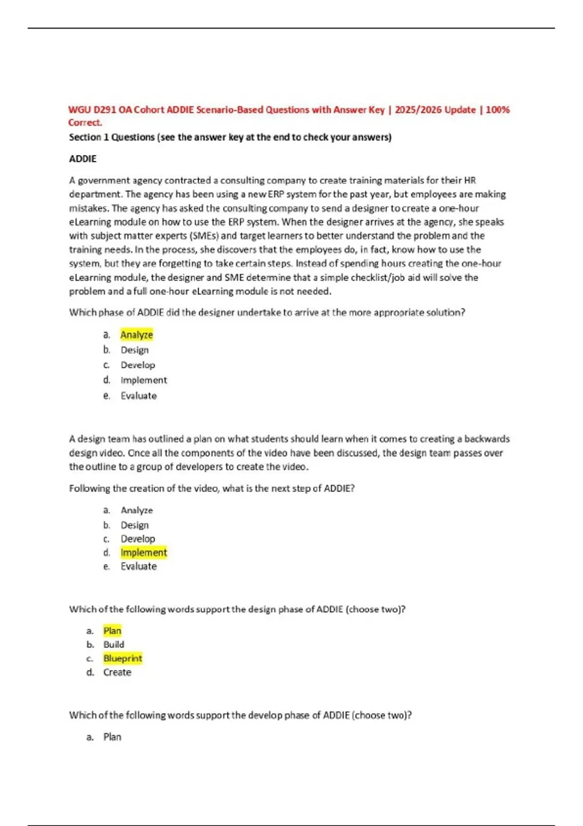 WGU D291 OA Cohort ADDIE Scenario-Based Questions with Answer Key | 2025/2026 Update | 100% Correct.
