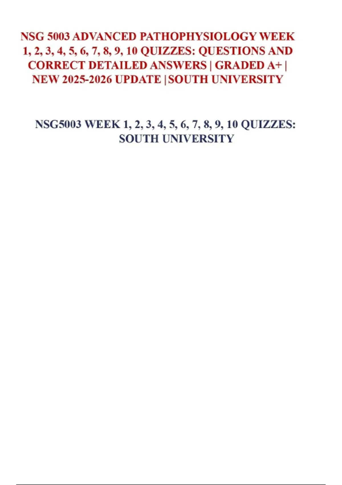 NSG 5003 ADVANCED PATHOPHYSIOLOGY WEEK 1, 2, 3, 4, 5, 6, 7, 8, 9, 10 QUIZZES: QUESTIONS AND CORRECT DETAILED ANSWERS | GRADED A+ | NEW UPDATE | SOUTH UNIVERSITY