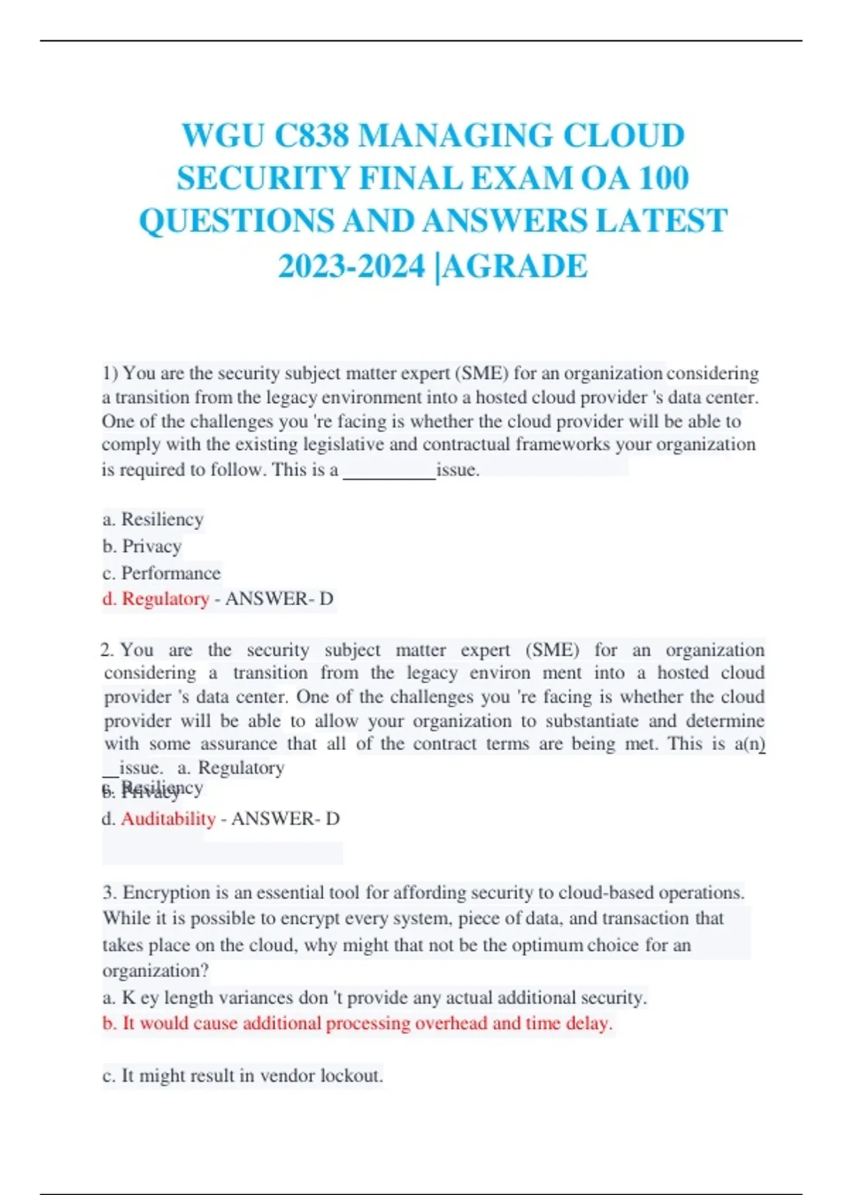 Ace your WGU C838 Managing Cloud Security Final Exam OA with this 2023–2024 updated test bank, featuring 100 verified questions and accurate answers. Designed specifically for Western Governors University students, this resource covers all essential topics including cloud infrastructure protection, encryption, access management, and data security policies. Each question is structured to match real OA exam patterns, ensuring comprehensive preparation and confidence on test day. Perfect for those pursuing WGU’s Information Security and Cloud Management track — download now to secure your A+ grade and advance your cybersecurity expertise.