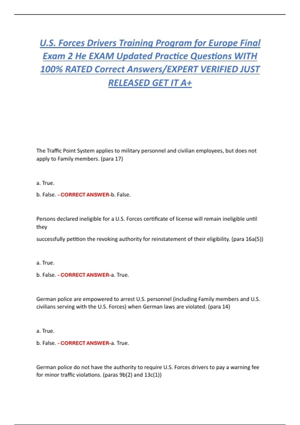 U.S. Forces Drivers Training Program for Europe Final Exam 2 (HE) evaluates drivers’ knowledge of European traffic laws, highway regulations, and emergency response procedures. Required for U.S. military personnel and dependents stationed in Europe, the exam ensures compliance with host-nation driving standards. Topics include road signs, speed limits, vehicle safety, and accident protocols. Study materials and practice quizzes help participants prepare for safe, lawful driving overseas.