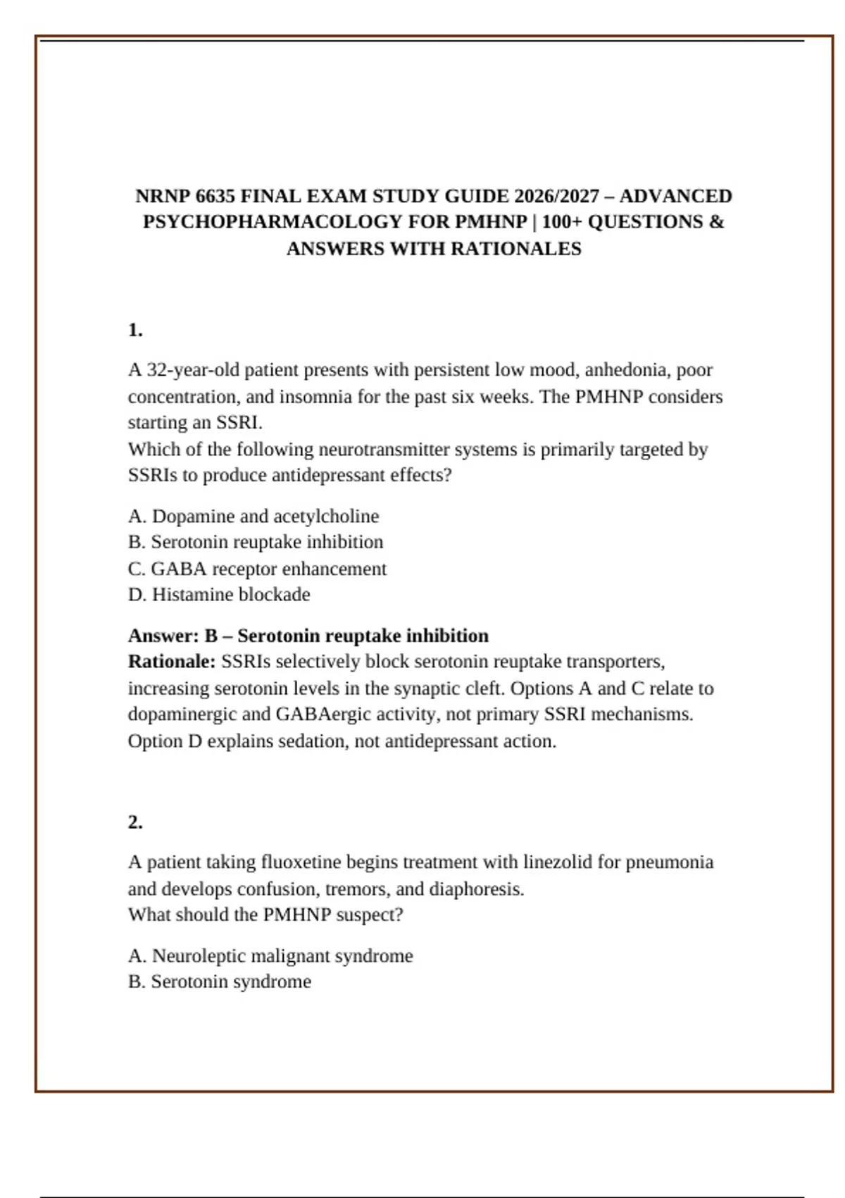 Ace your NRNP 6635 Advanced Psychopharmacology for the PMHNP exam with this comprehensive, 2026/2027 updated study guide. Includes 100+ expertly written mock questions and detailed rationales covering antidepressants, antipsychotics, mood stabilizers, anxiolytics, and psychotropic drug interactions. Designed for PMHNP students, this A+ resource strengthens clinical reasoning, enhances prescribing confidence, and guarantees exam-level mastery. Perfect for Walden University NRNP 6635 review or independent PMHNP board prep. Download, study, and succeed with HealthStudyPro – your trusted nursing study companion.
