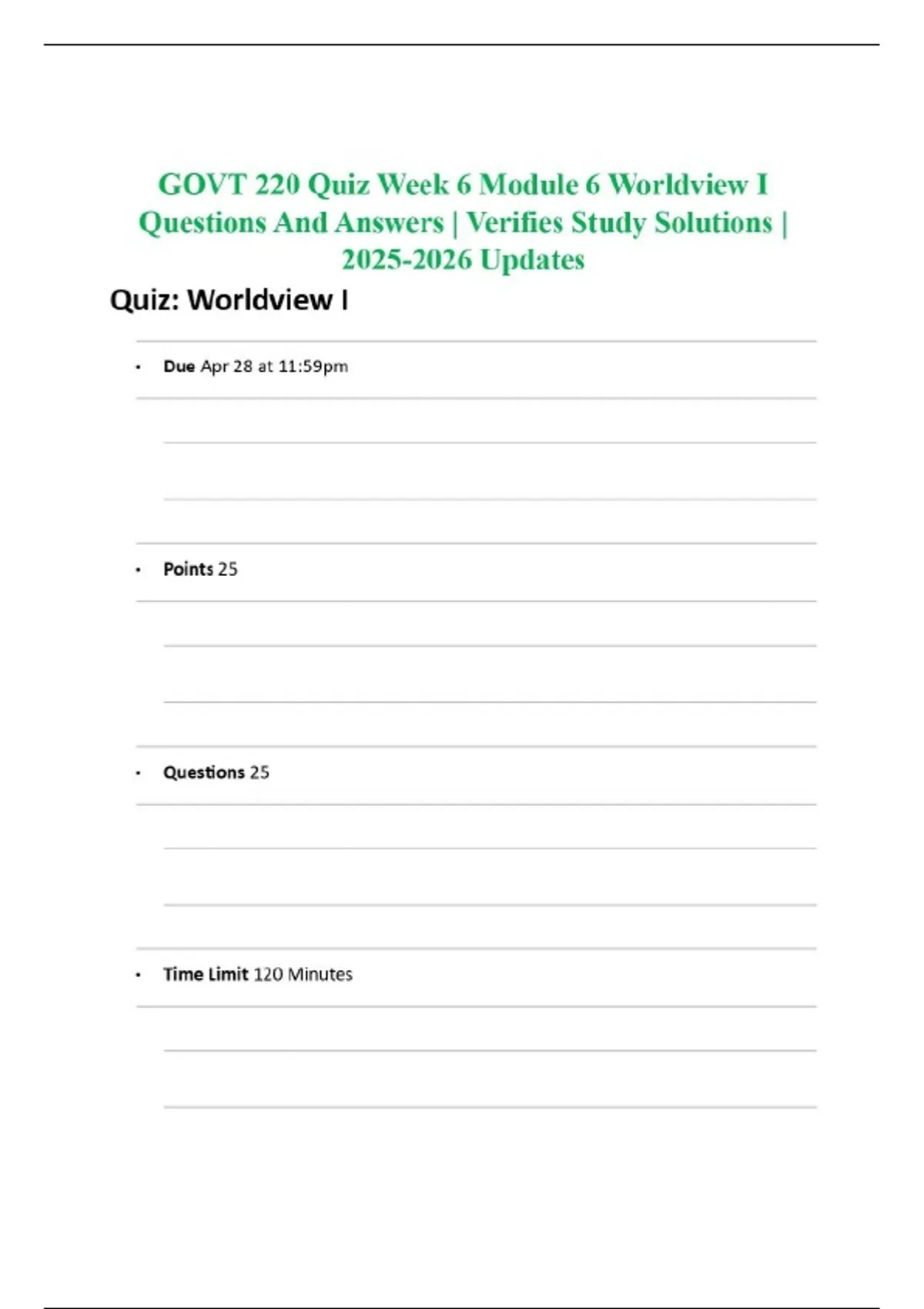 GOVT 220 Quiz Week 6 Module 6 Worldview I Questions And Answers | Verifies Study Solutions | Updates