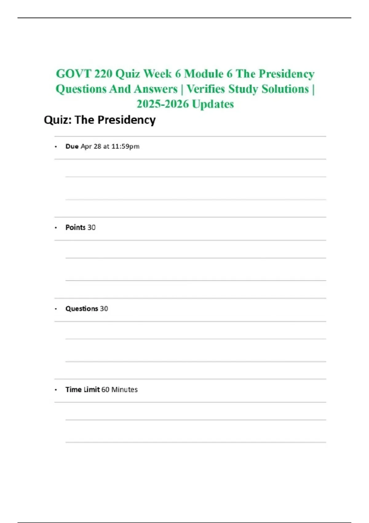 GOVT 220 Quiz Week 6 Module 6 The Presidency Questions And Answers | Verifies Study Solutions | Updates