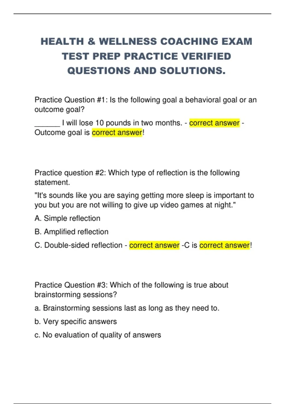 HEALTH & WELLNESS COACHING EXAM TEST PREP PRACTICE VERIFIED QUESTIONS AND SOLUTIONS.